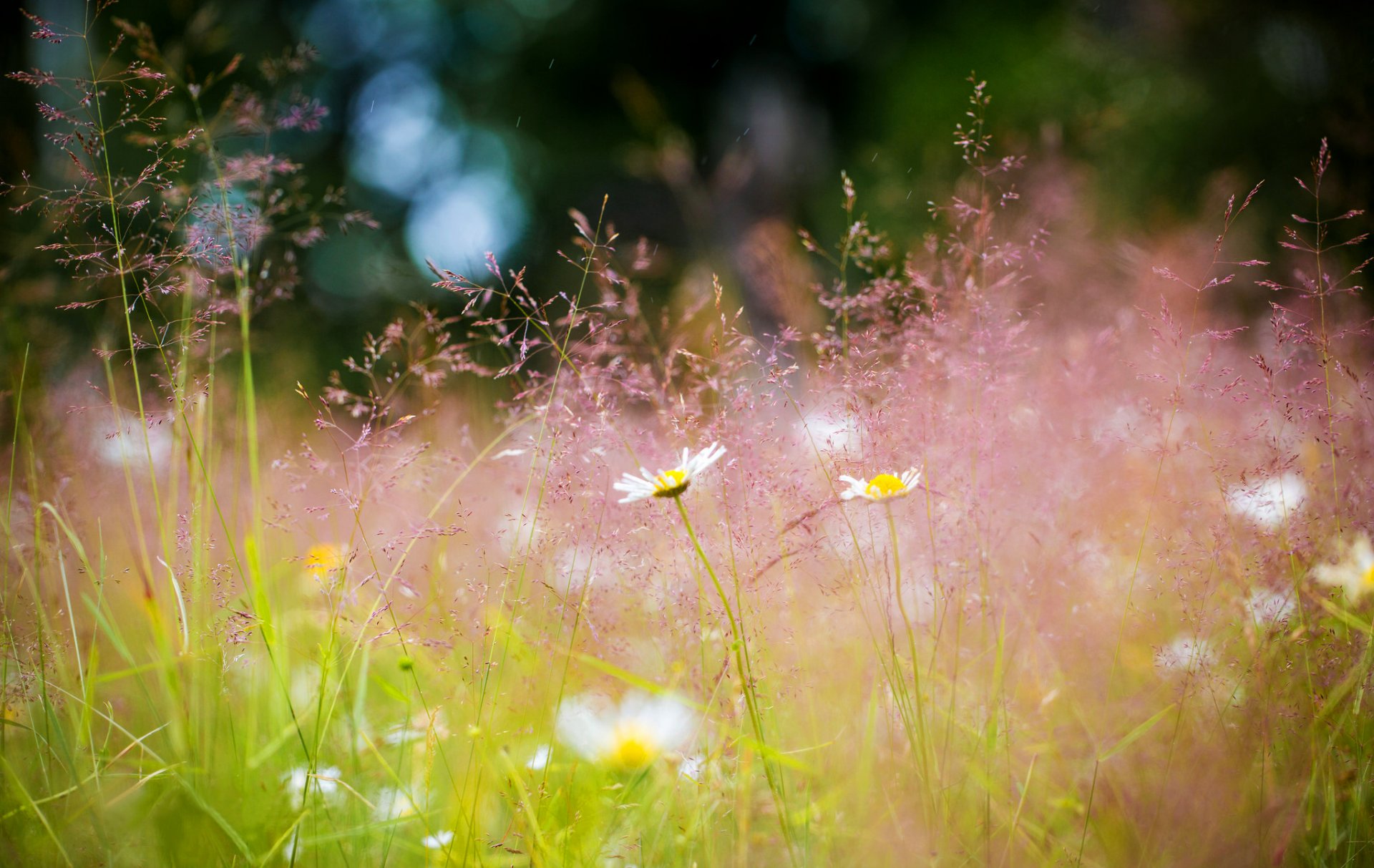 Margaritas silvestres de pradera en un fondo de vegetaciónMargaritas silvestres de pradera en un fondo de vegetación