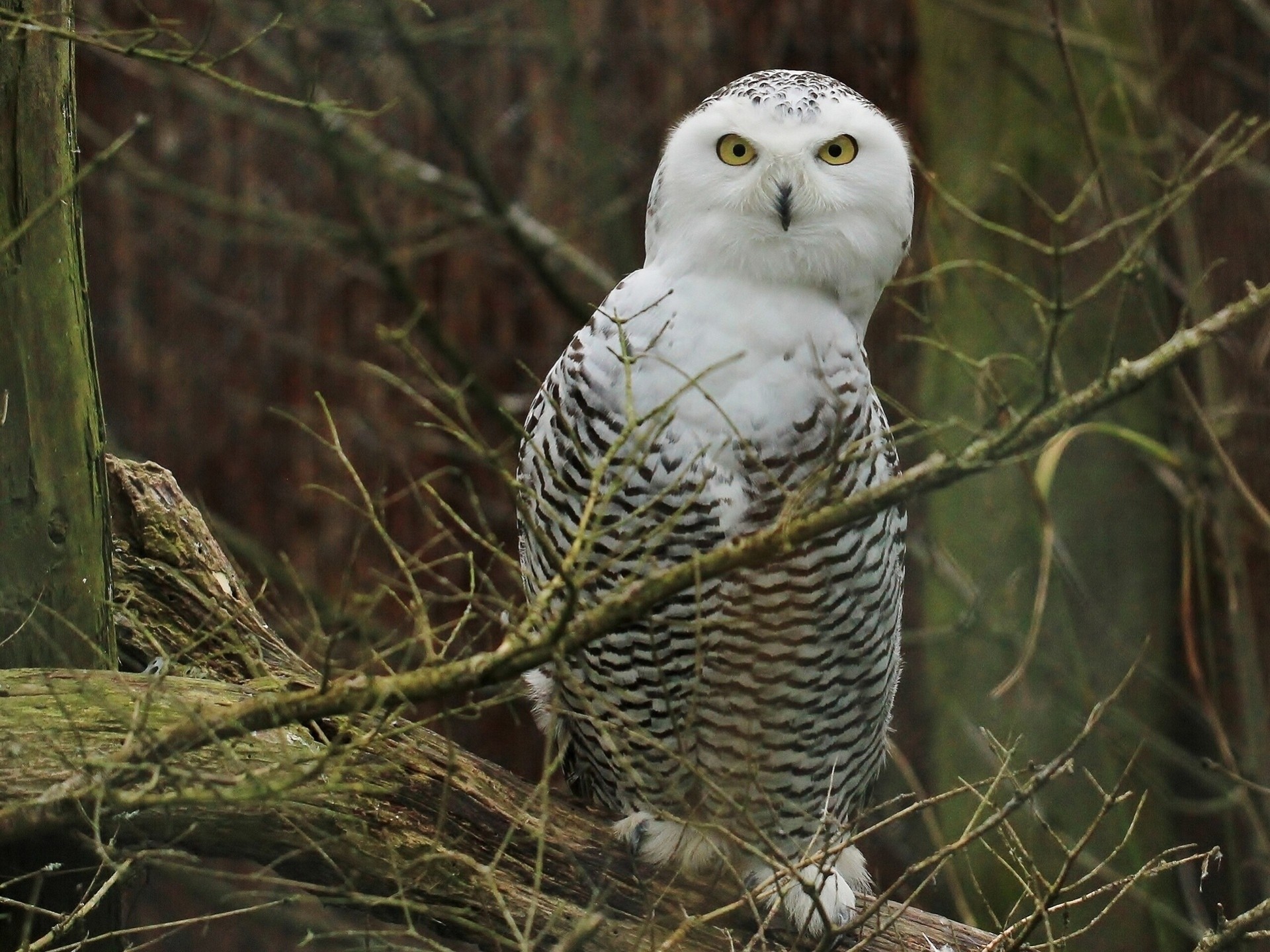 Búho blanco sentado en una rama en el bosque