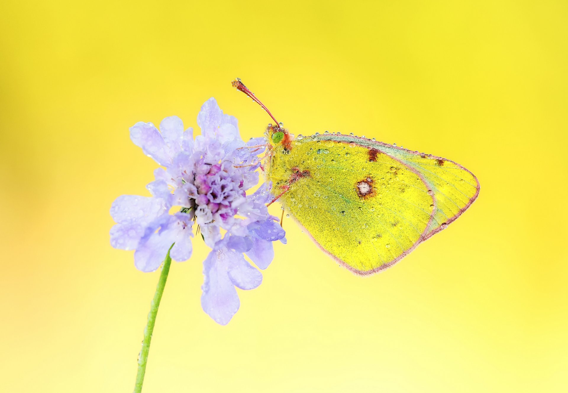 Mariposa en una flor en gotas de agua