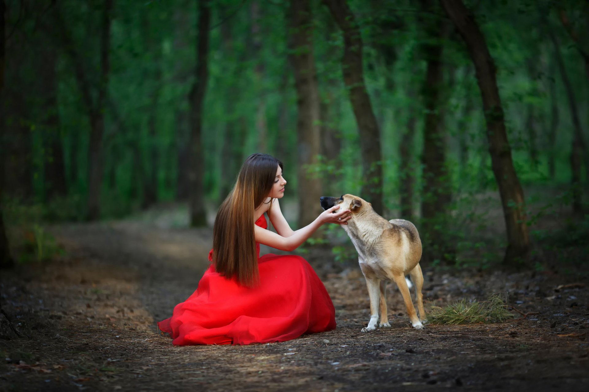 Una chica con un vestido rojo, con un perro. proogulka en el bosqueUna chica con un vestido rojo, con un perro. Proogulka en el bosque