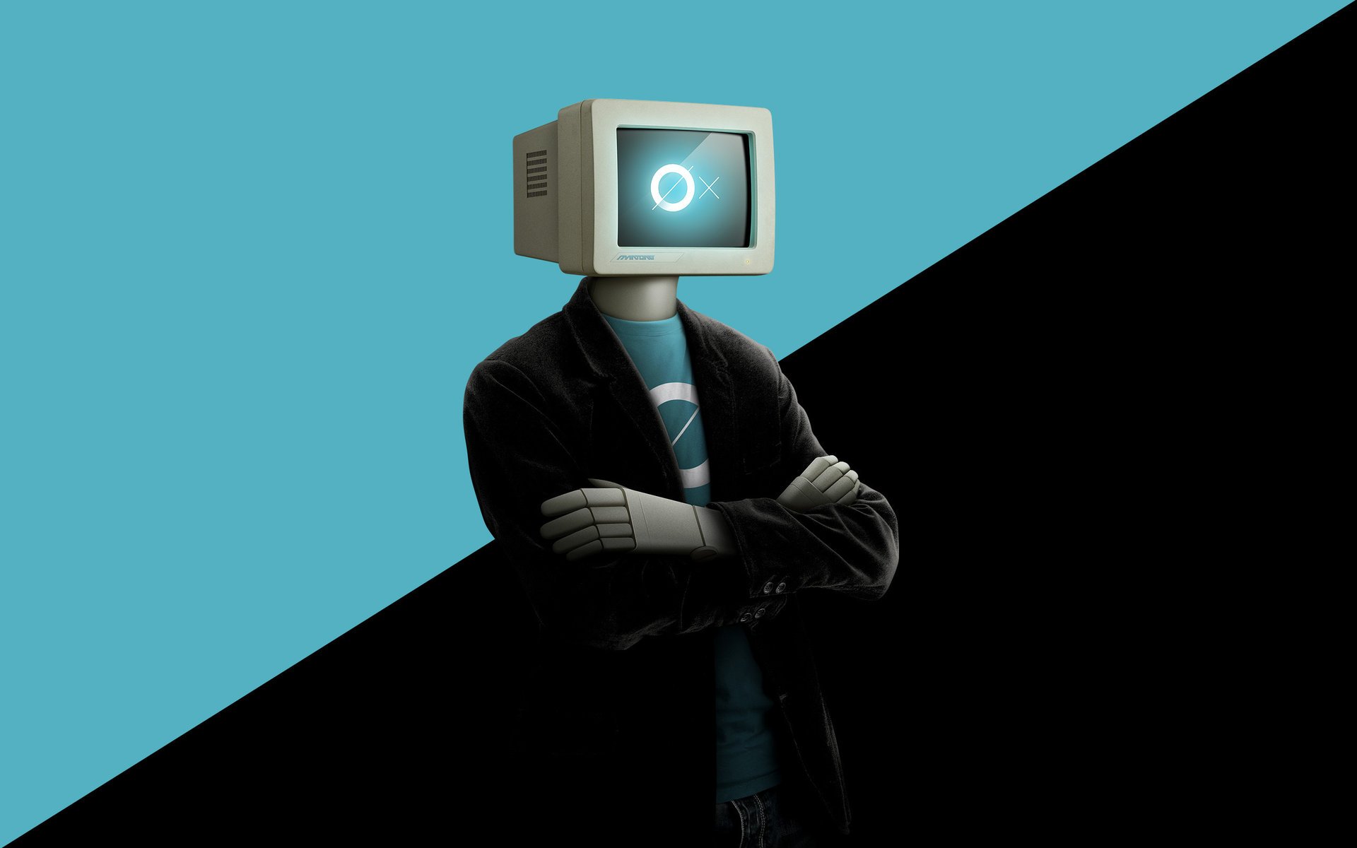 Un robot con un monitor en lugar de una cabeza se sienta en el espacioUn robot con un Monitor en lugar de una cabeza se sienta en el espacio