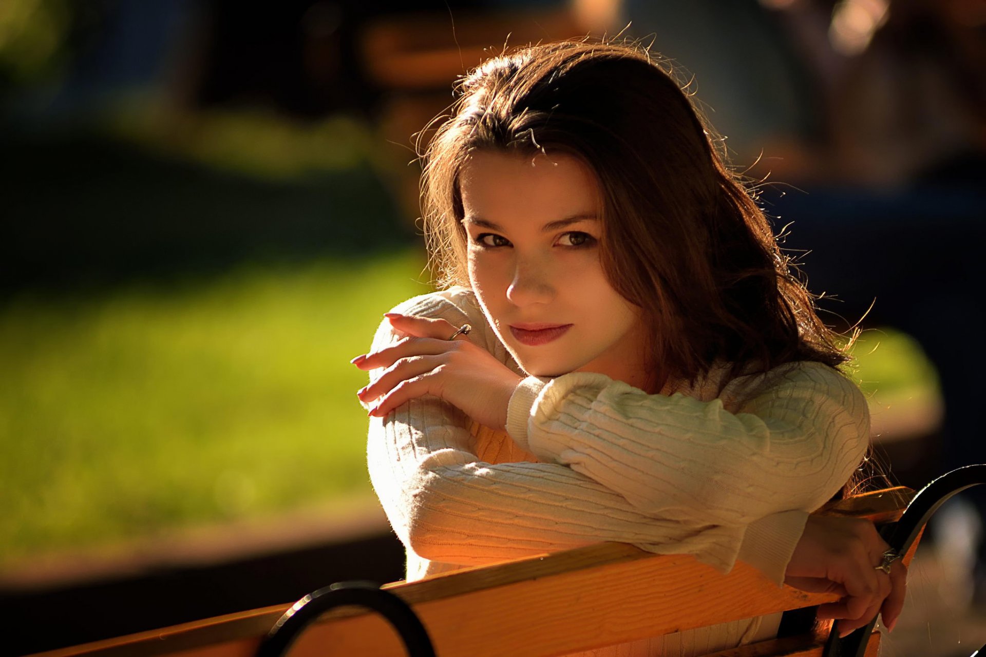 Chica en vestido blanco yace con una sonrisa en su cara a la luz del sol