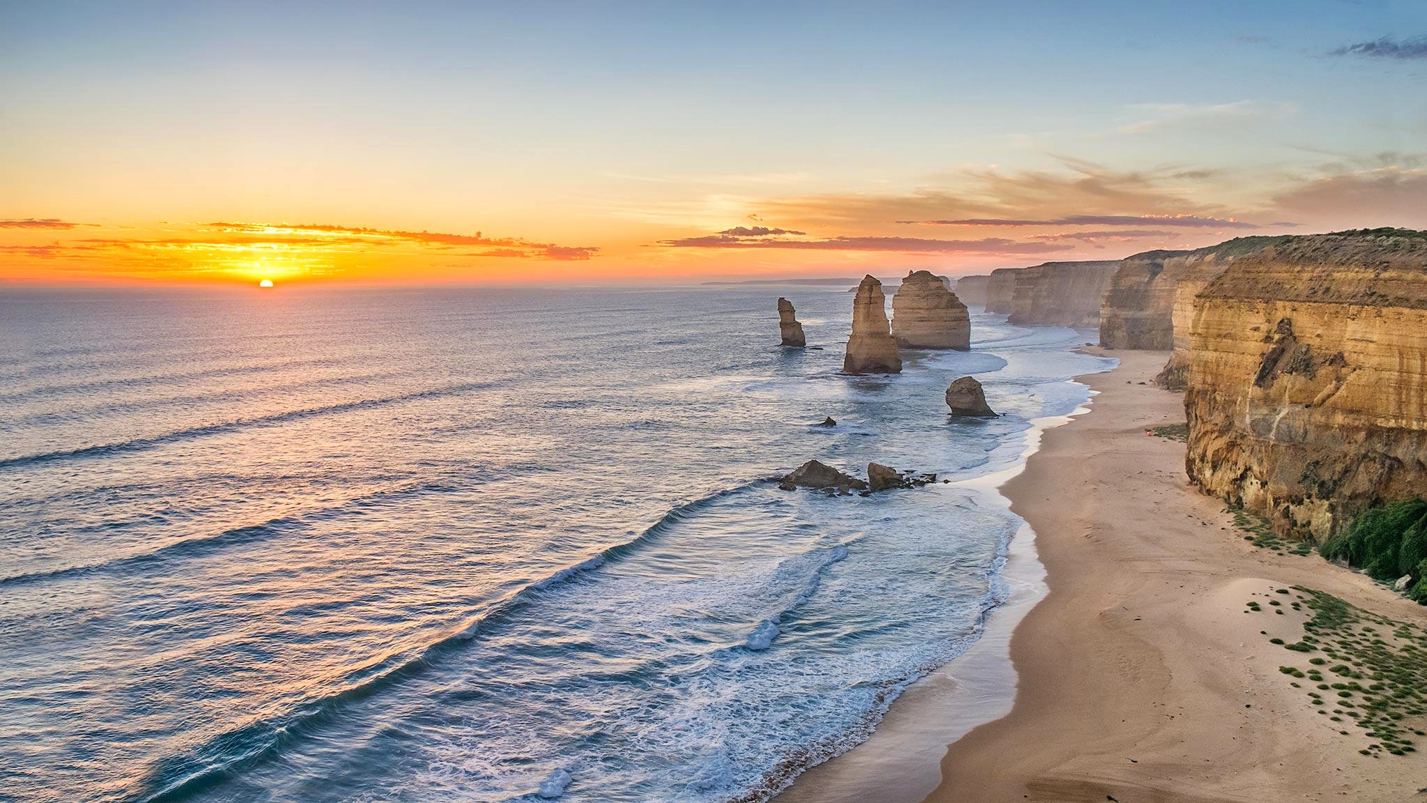 Mar azul, sol de puesta de sol y dos gaviotas solitariasMar azul, sol de puesta de sol y dos gaviotas solitarias