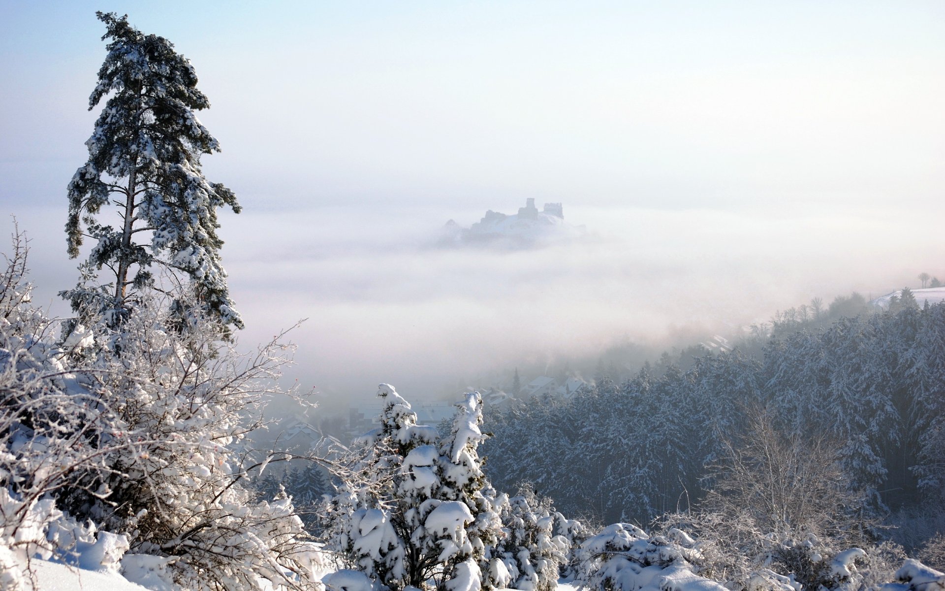 La niebla cubre el bosque cubierto de nieve de invierno, ocultando los árbolesLa niebla cubre el bosque cubierto de nieve de invierno, ocultando los árboles
