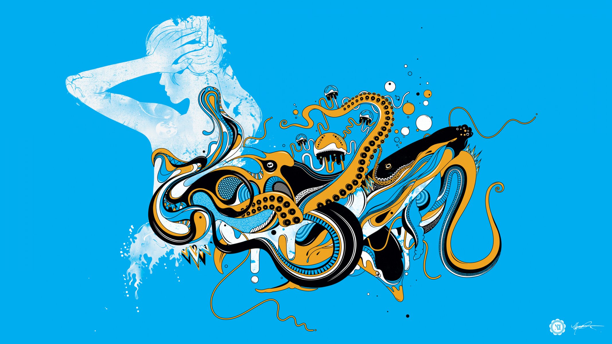 Sobre un fondo azul, una devulka blanca y un pulpo amarilloSobre un fondo azul, una devulka blanca y un pulpo amarillo