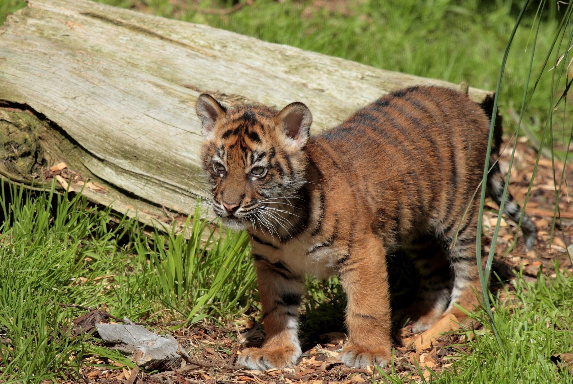 Un cachorro de tigre cerca de un tronco mira a lo lejosUn cachorro de tigre cerca de un tronco Mira a lo lejos