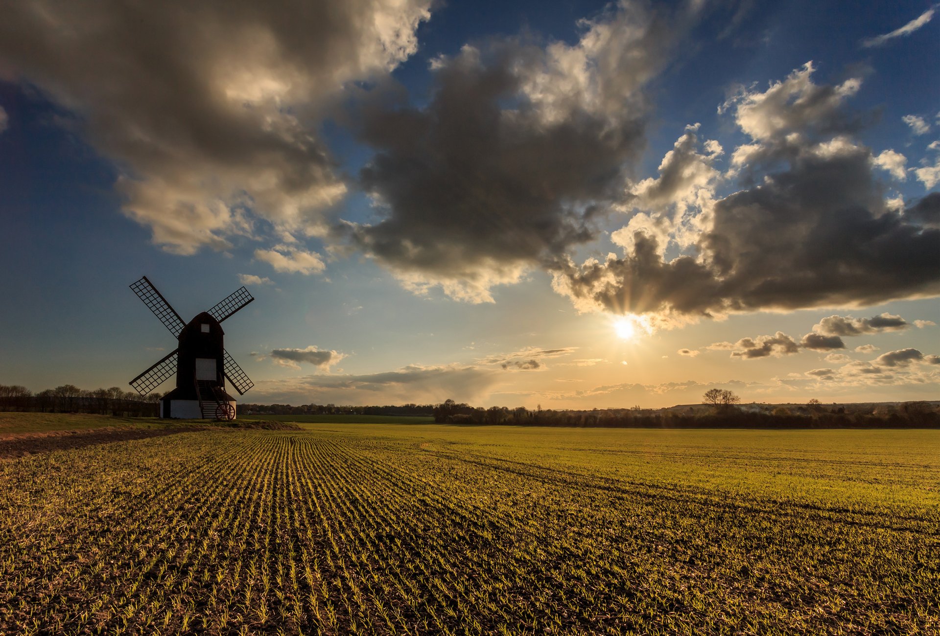 Un molino en un campo infinito iluminado por el sol que se abre paso a través de densas nubes