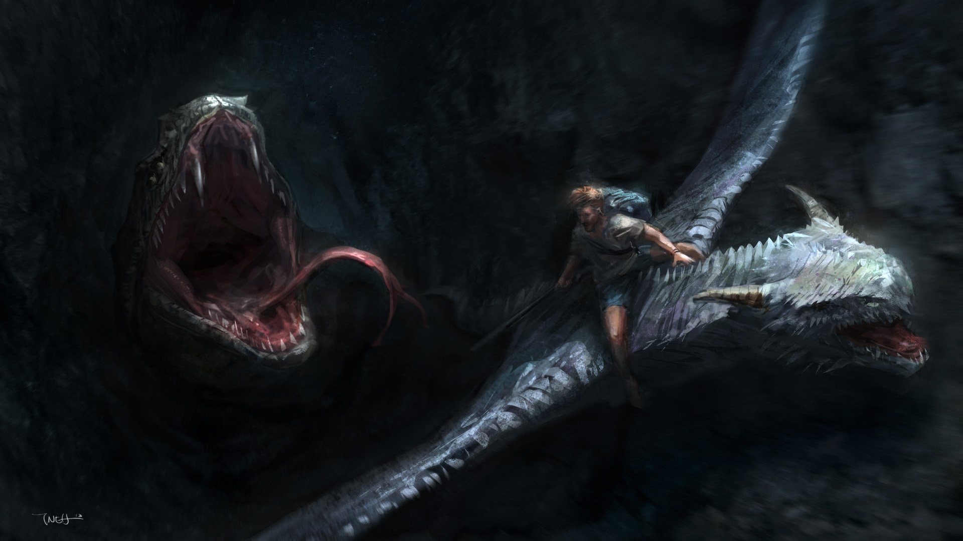 Arte de fantasía con un monstruo en el lago junto al faro