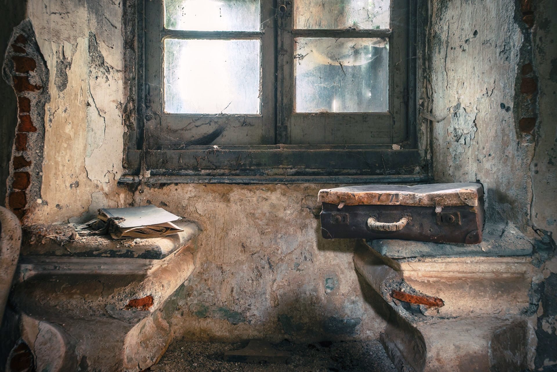 Una botella y un armario contra una pared deshilachadaUna botella y un armario contra una pared deshilachada