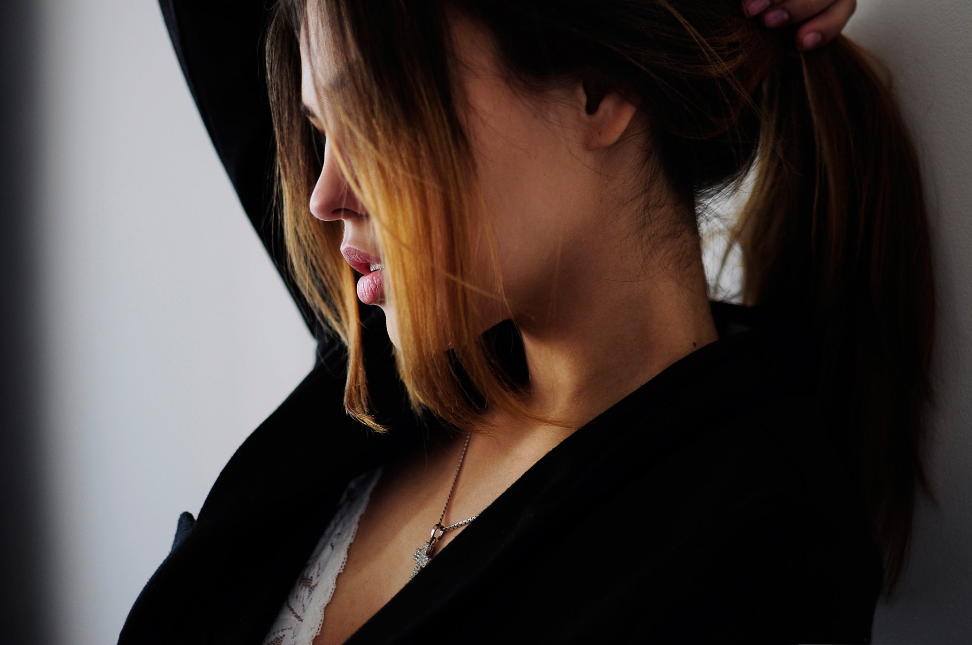Pelo castaño con cola de caballo en gafas de sol y camiseta beige de sedaPelo castaño con cola de caballo en gafas de sol y camiseta beige de seda