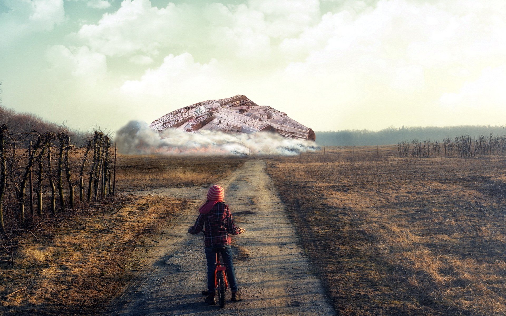 Una niña en velisopeda mirando una nave alienígena que cayó a la tierra ficción