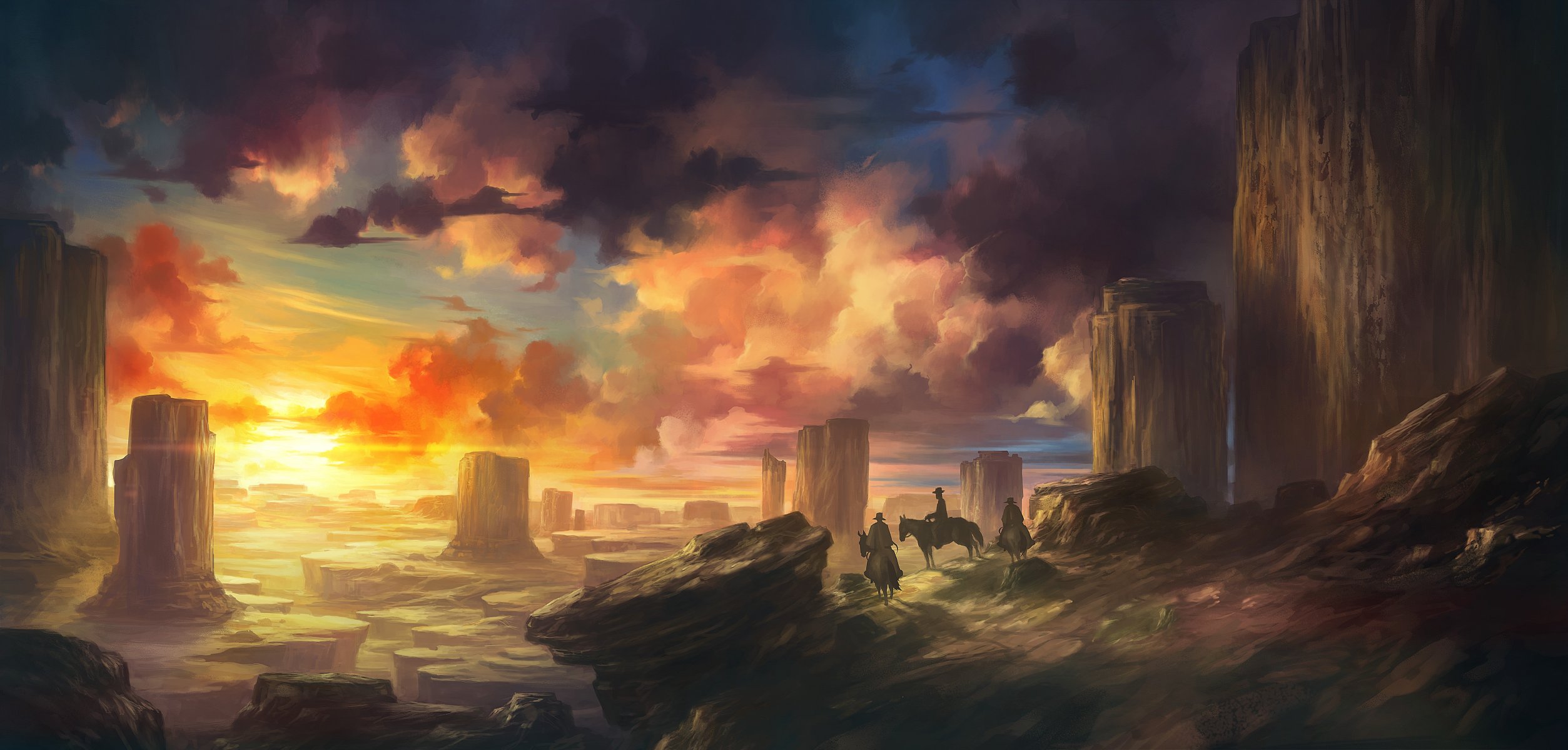 Paisaje pintoresco con vaqueros y nubes