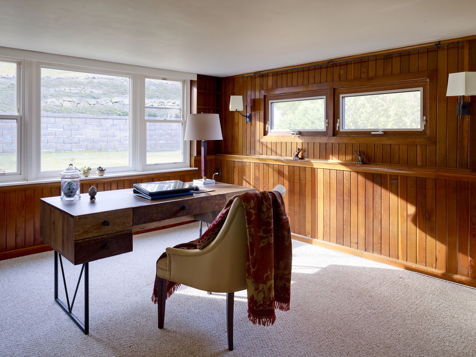 Gabinete de trabajo revestido con listón de madera iluminado por el solGabinete de trabajo revestido con listón de madera iluminado por el sol