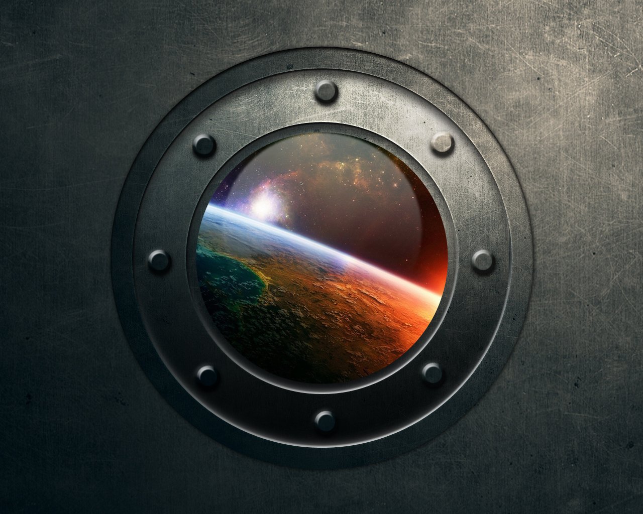 Vista desde el ojo de buey del planeta tierra. vehículo espacialVista desde el ojo de buey del planeta Tierra. Vehículo espacial