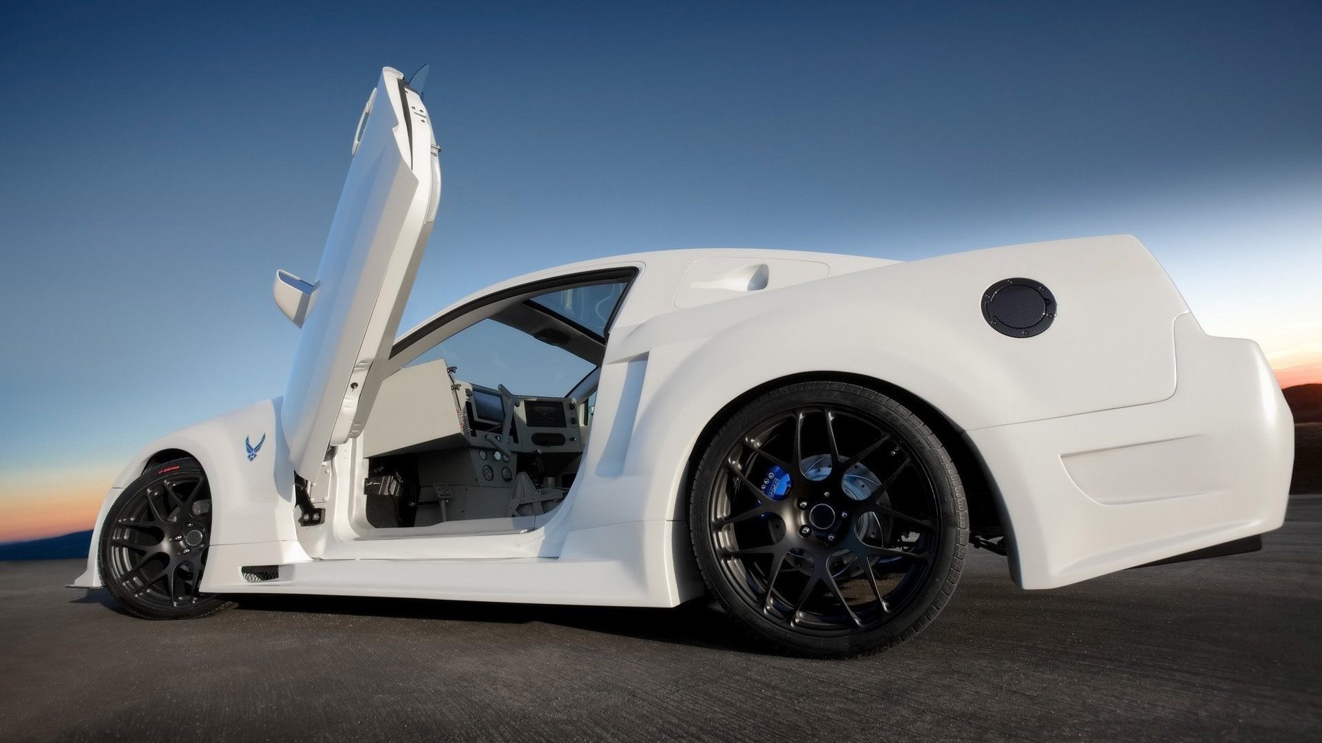 Ford mustang negro con faros encendidos en el fondo de la puesta de solFord Mustang negro con faros encendidos en el fondo de la puesta de sol