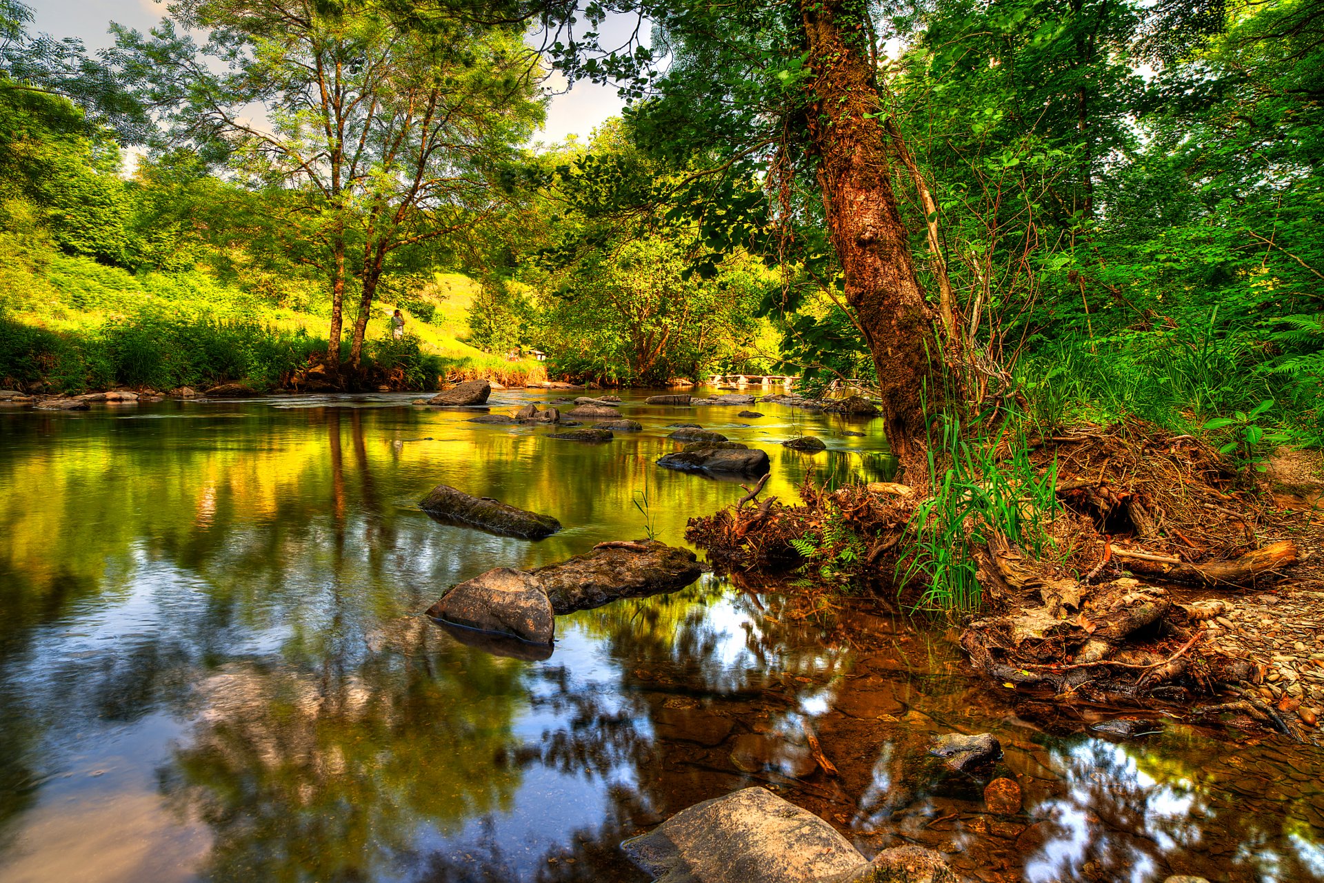 Hermoso paisaje del río en el bosque verde con árboles de navidad y matorralesHermoso paisaje del río en el bosque verde con árboles de Navidad y matorrales