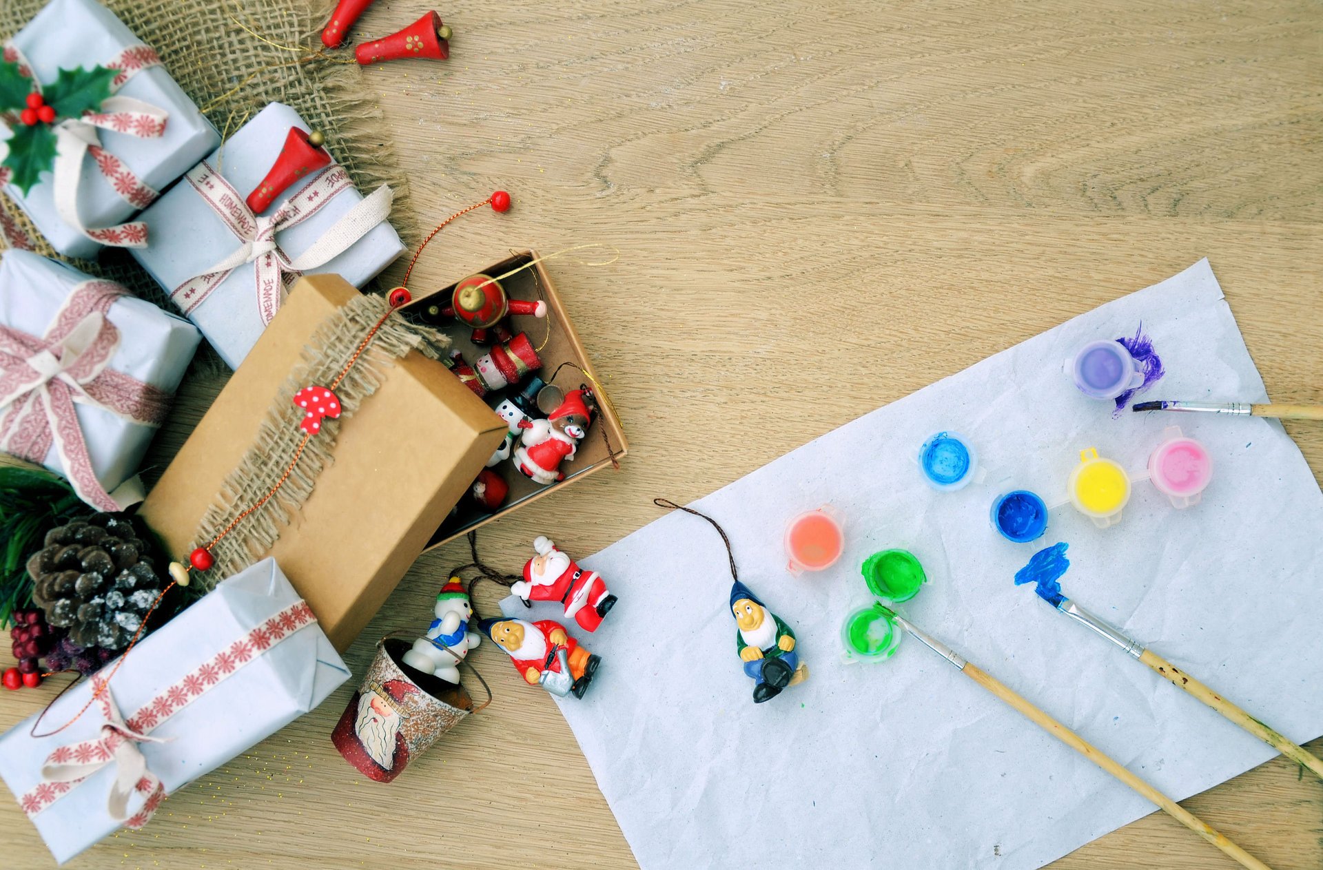 Una hoja de papel con pinturas y regalos en el pisoUna hoja de papel con pinturas y regalos en el piso