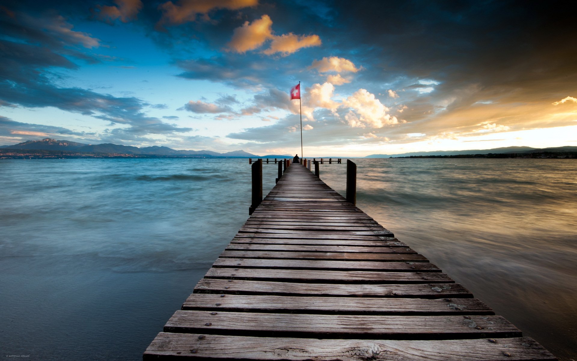 Un muelle que se adentra en el mar contra el cielo nublado de la tardeUn muelle que se adentra en el mar contra el cielo nublado de la tarde