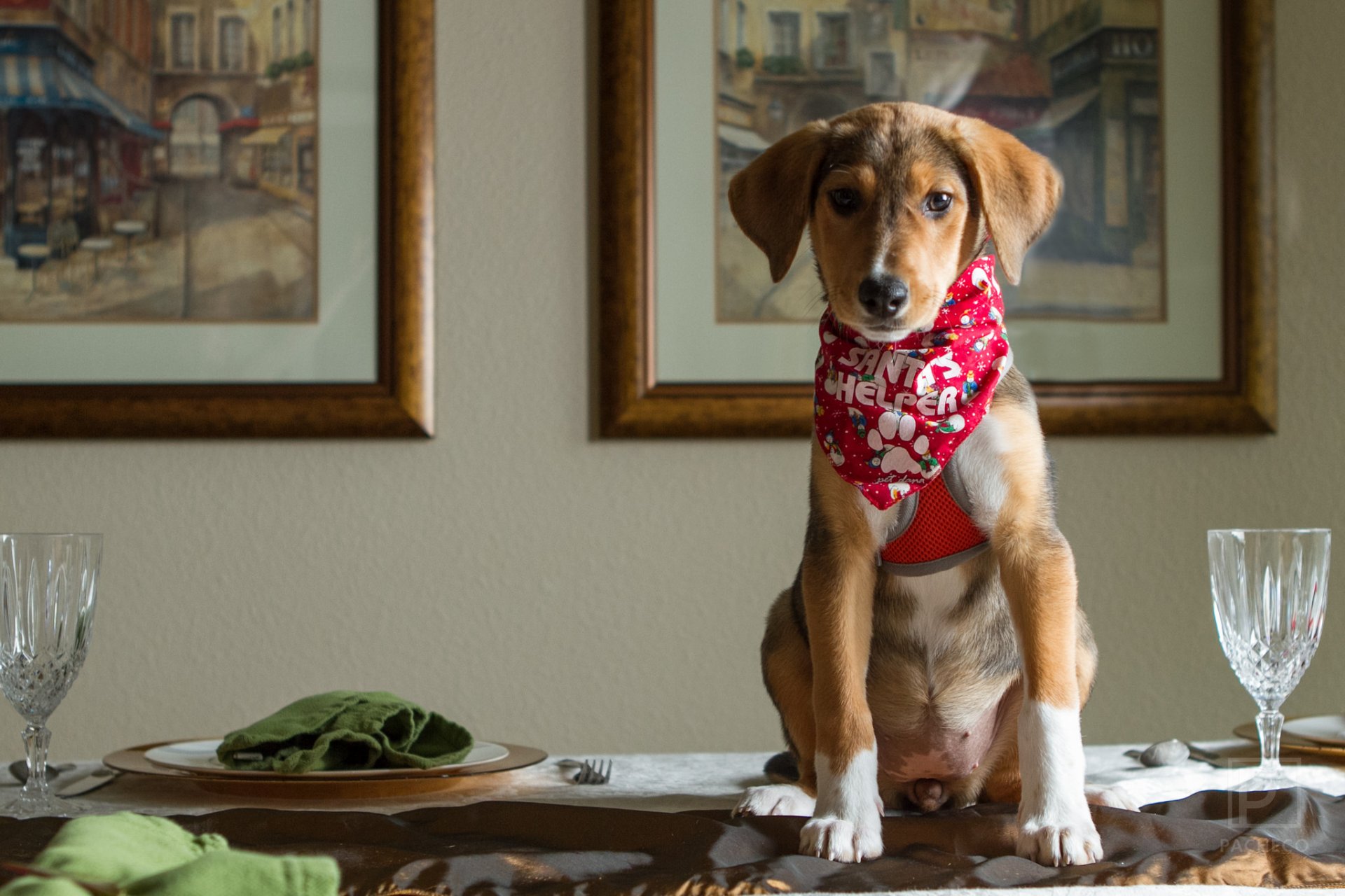 Pequeño perro de caza con un lazo rojo en el cuello de pie en el campoPequeño perro de caza con un lazo rojo en el cuello de pie en el campo