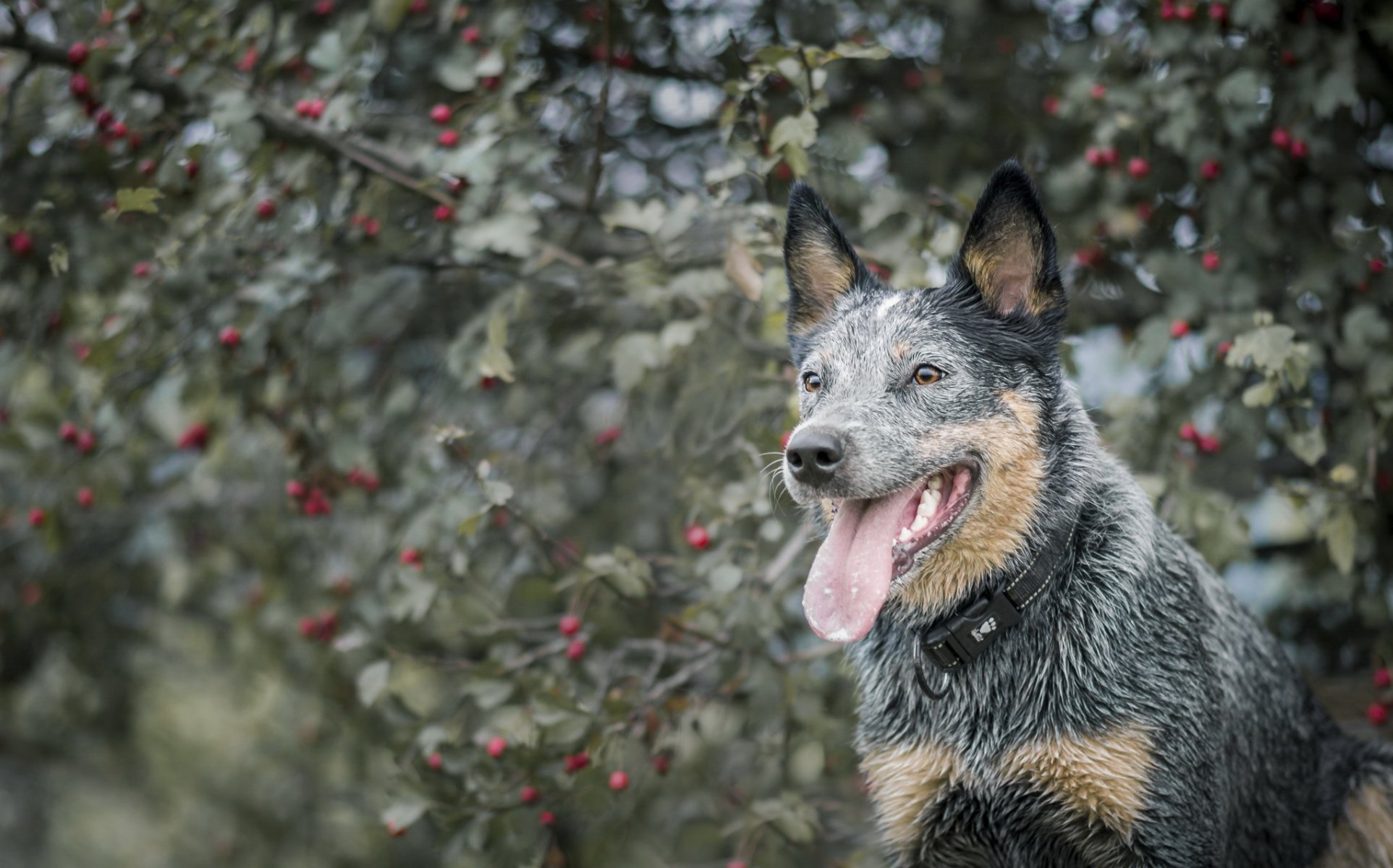 Perro mojado de pie junto al serbal
