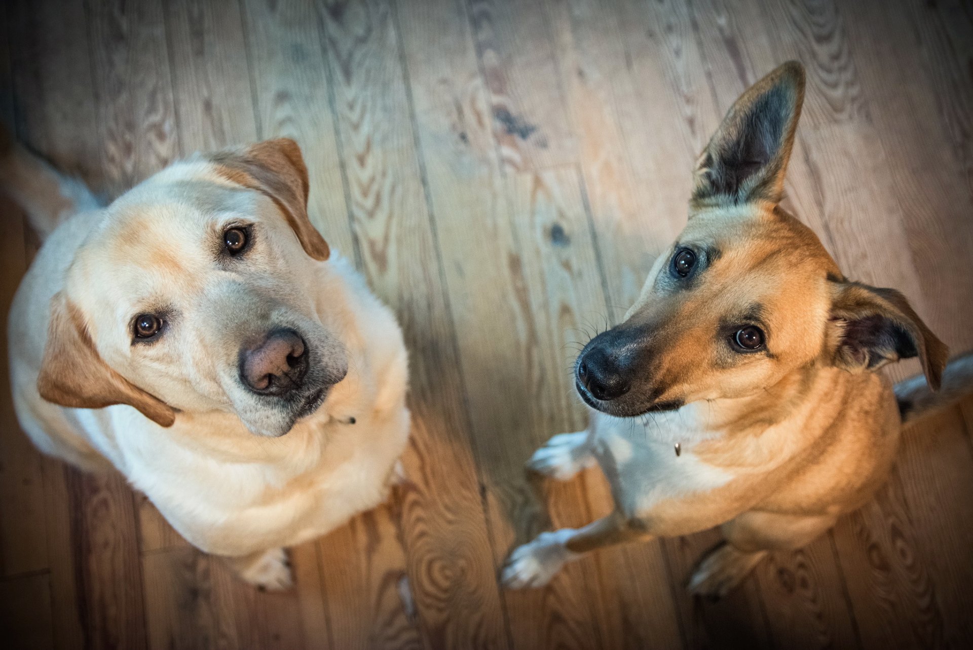 Dos perros mirando al marco contra el fondo de un piso de madera