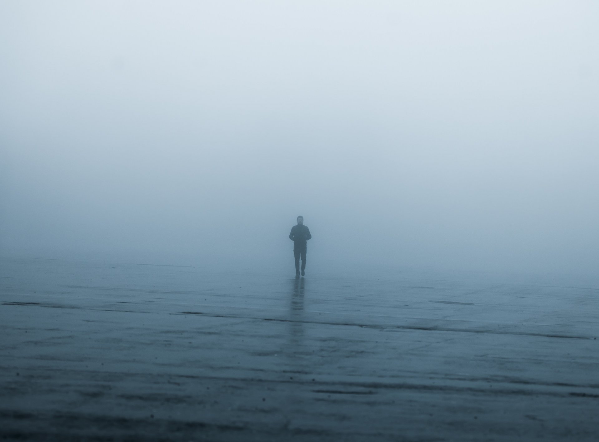 Hombre solitario en la niebla durante la lluvia