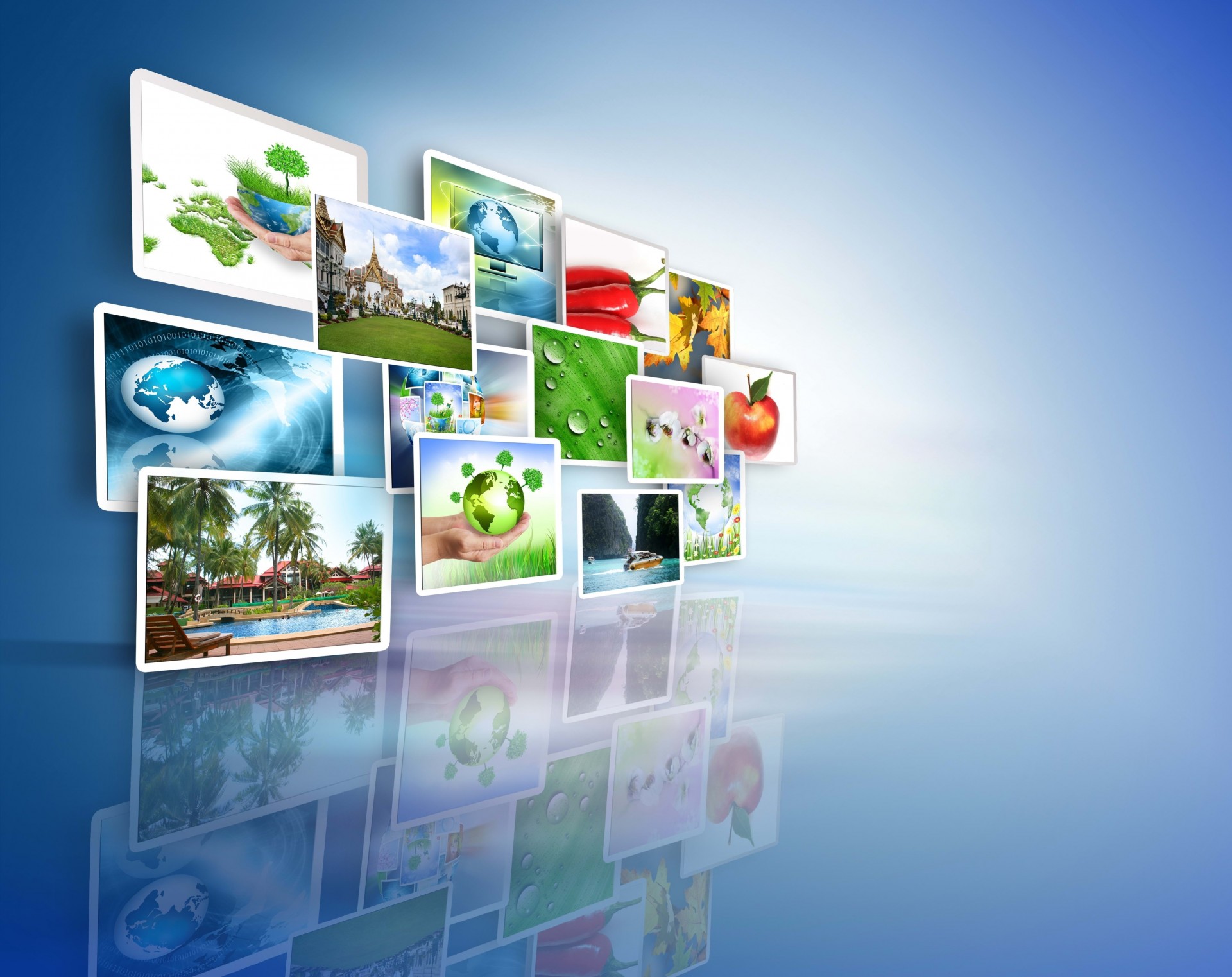 Muchas pinturas brillantes y hermosas sobre un fondo azulMuchas pinturas brillantes y hermosas sobre un fondo azul