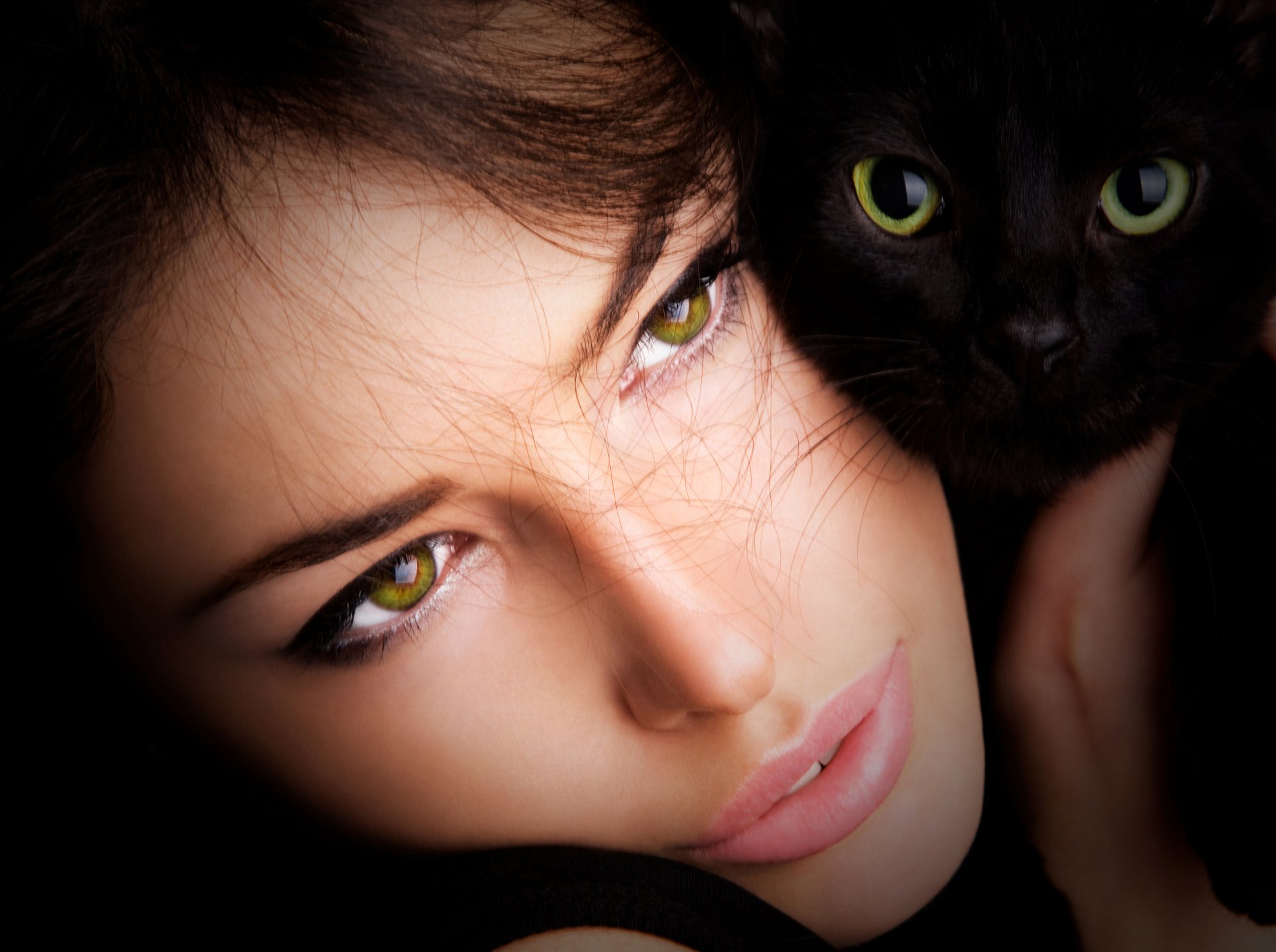 Chica de ojos verdes con un gato negro de ojos verdesChica de ojos verdes con un gato negro de ojos verdes