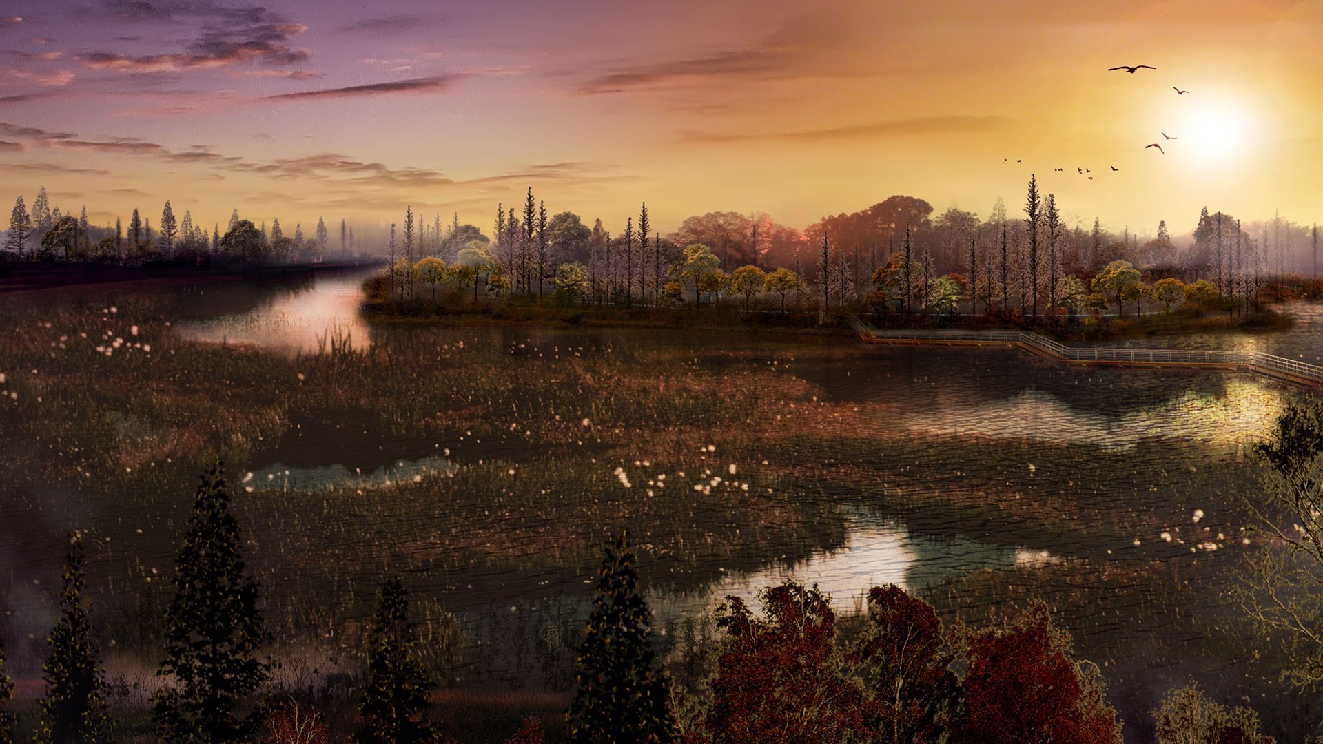 Puesta de sol natural cerca del estanque