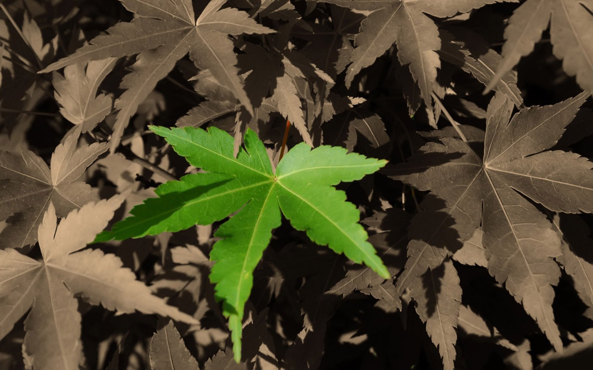 Una hoja brillante en el mundo gris de las calles de la ciudad
