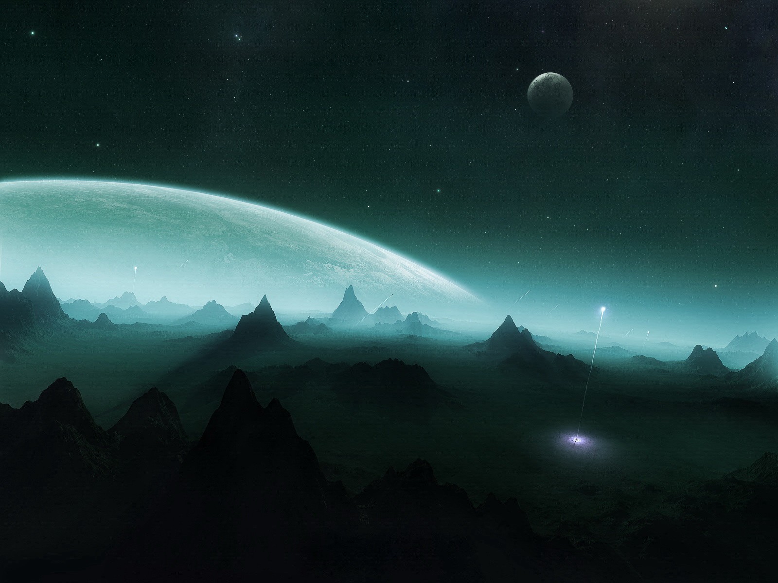 Fondos de pantalla de la montaña en un planeta deshabitado y un rayo de luz