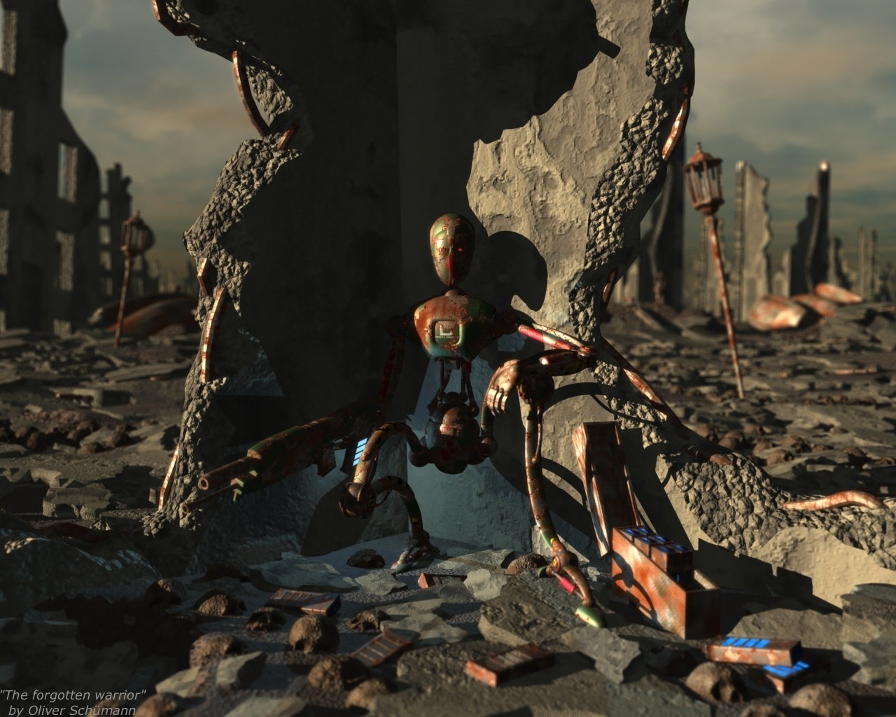 Robot sentado en una ciudad destruida