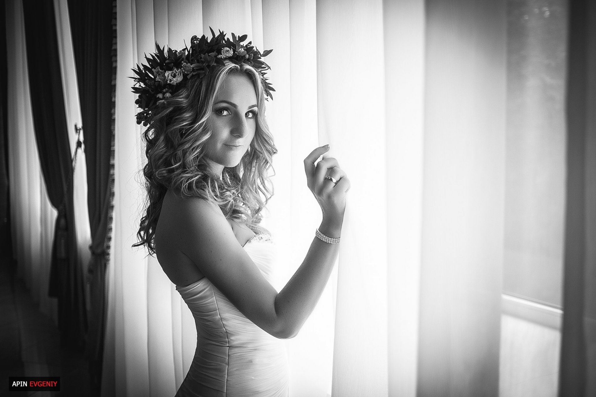 Foto en blanco y negro de una niña en una corona