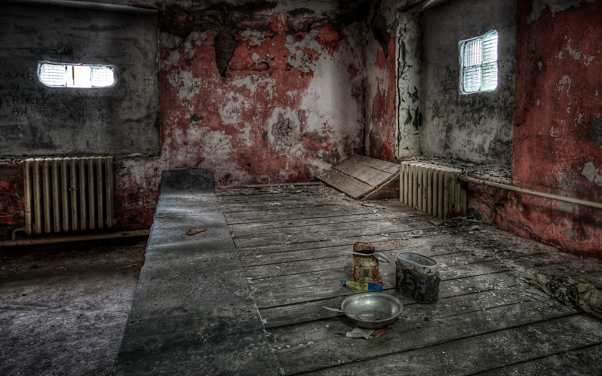 El interior de la sala de hormigón deshilachado con una gran ventanaEl interior de la sala de hormigón deshilachado con una gran ventana
