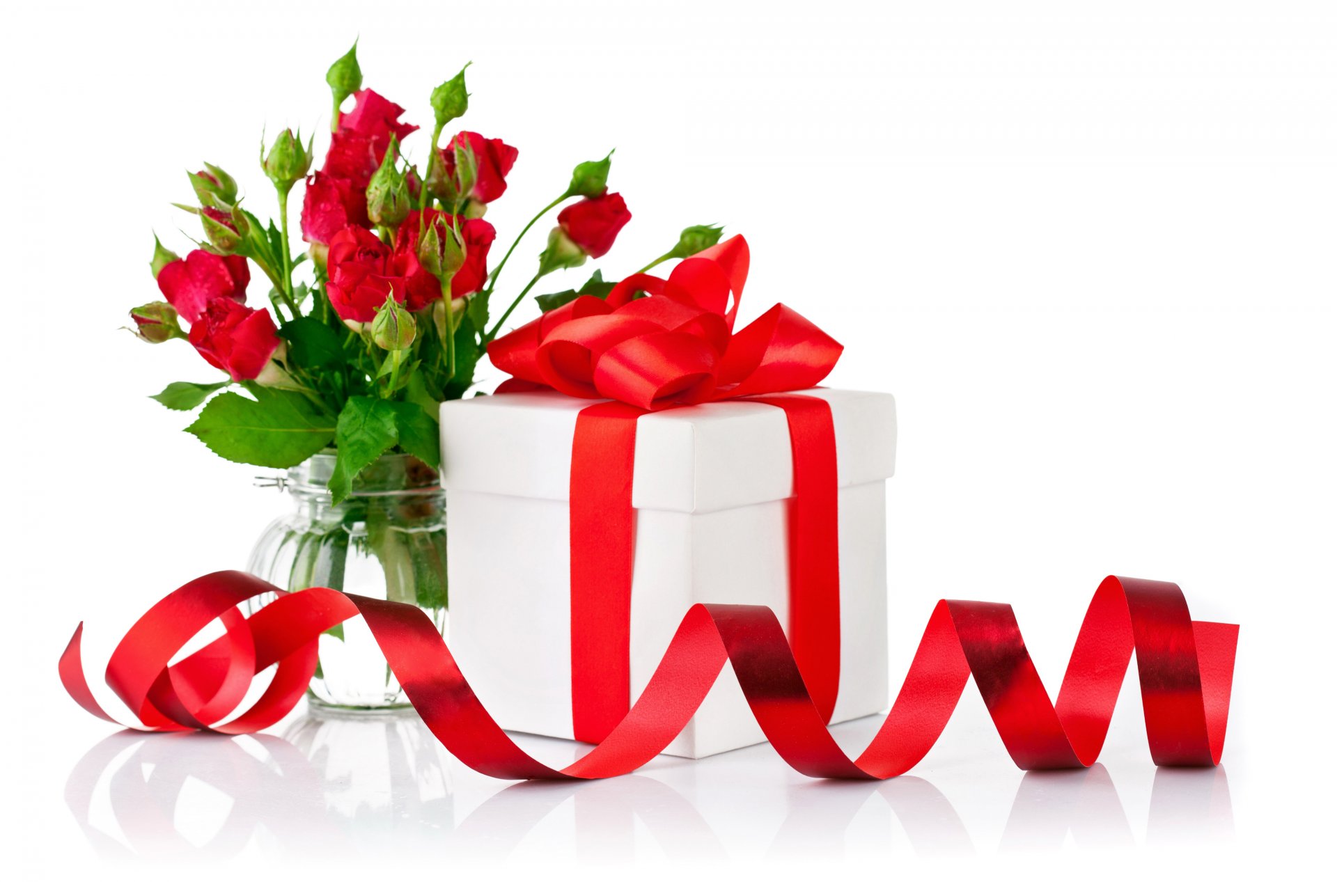 Regalo con lazo rojo y rosas