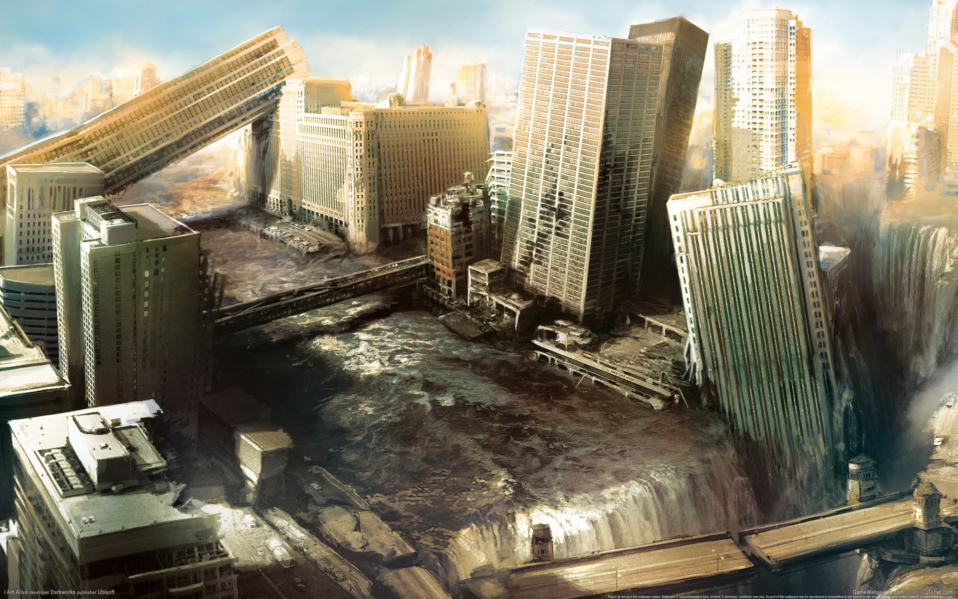 Ruinas de una metrópoli en el fondo de un río de ruinas