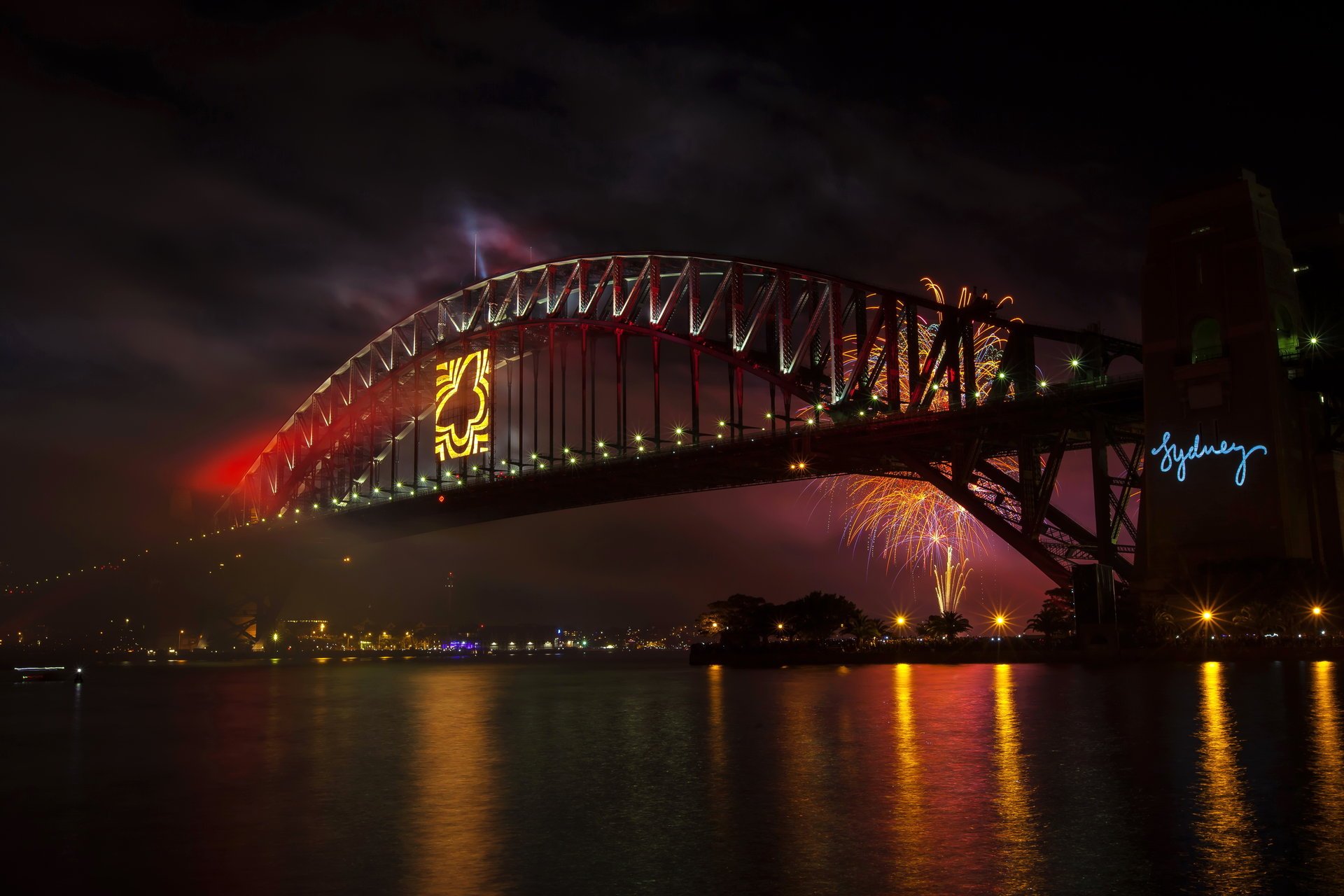 Australia, Ópera de Sydney al atardecer iluminada por las luces de la noche