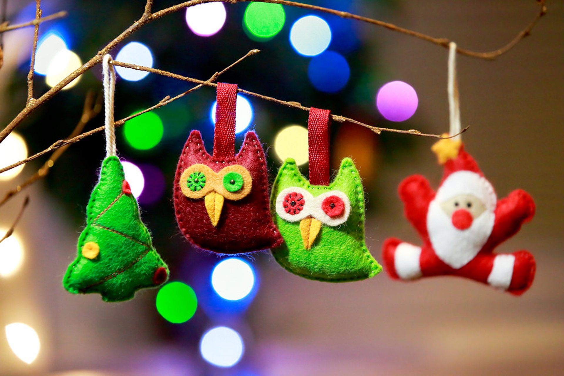 Búhos verdes y rojos con un árbol de navidad y santa claus en una rama