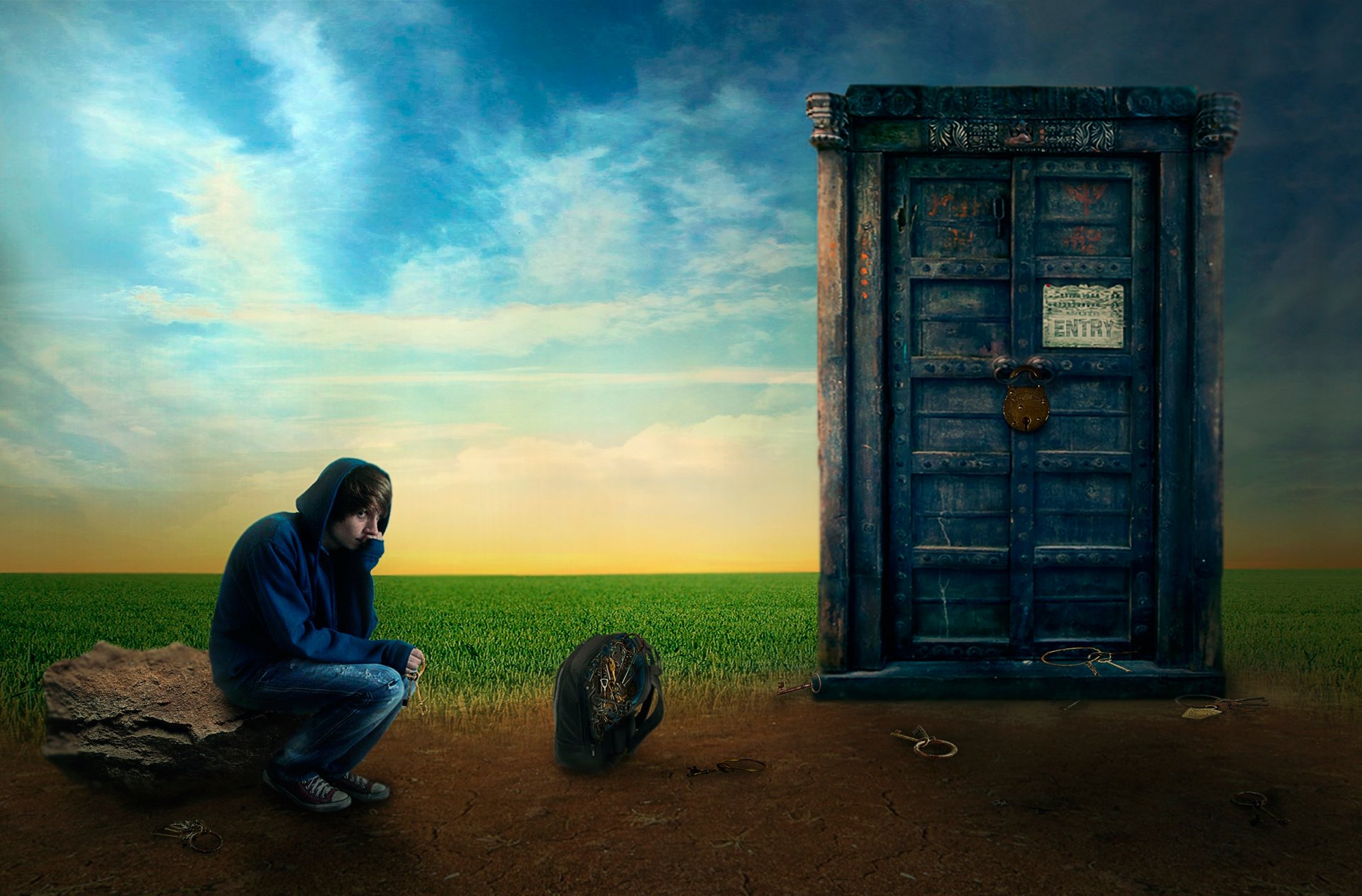 Un hombre con un traje de barbero se sienta en una mesa de madera frente a una sartén con tijerasUn hombre con un traje de barbero se sienta en una mesa de madera frente a una sartén con tijeras