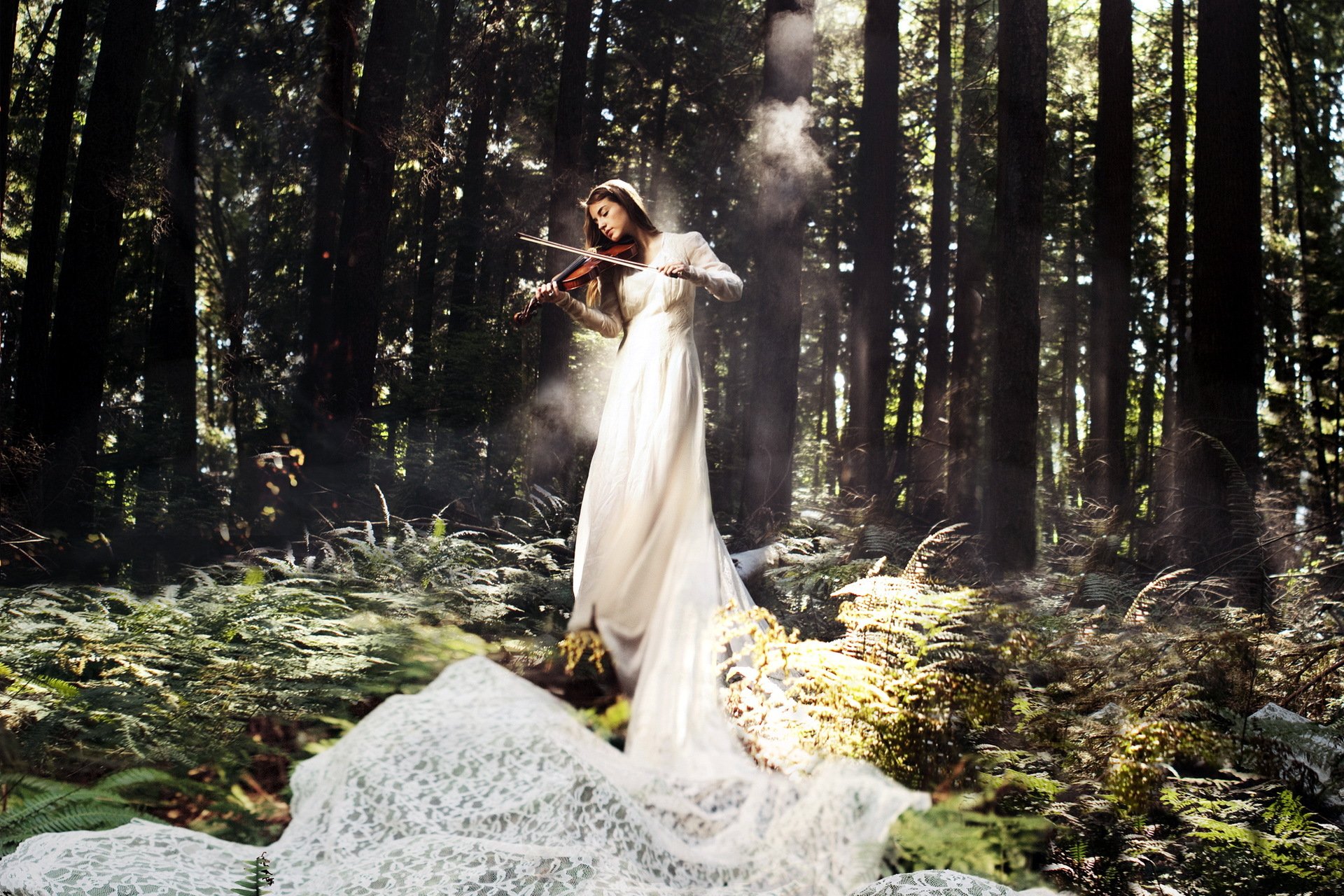 Chica con un violín en un vestido blanco en el fondo del bosqueChica con un violín en un vestido blanco en el fondo del bosque