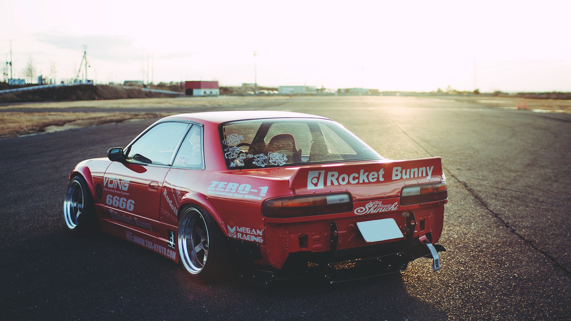 Nissan en un camino vacío en medio de una puesta de solNissan en un camino vacío en medio de una puesta de sol
