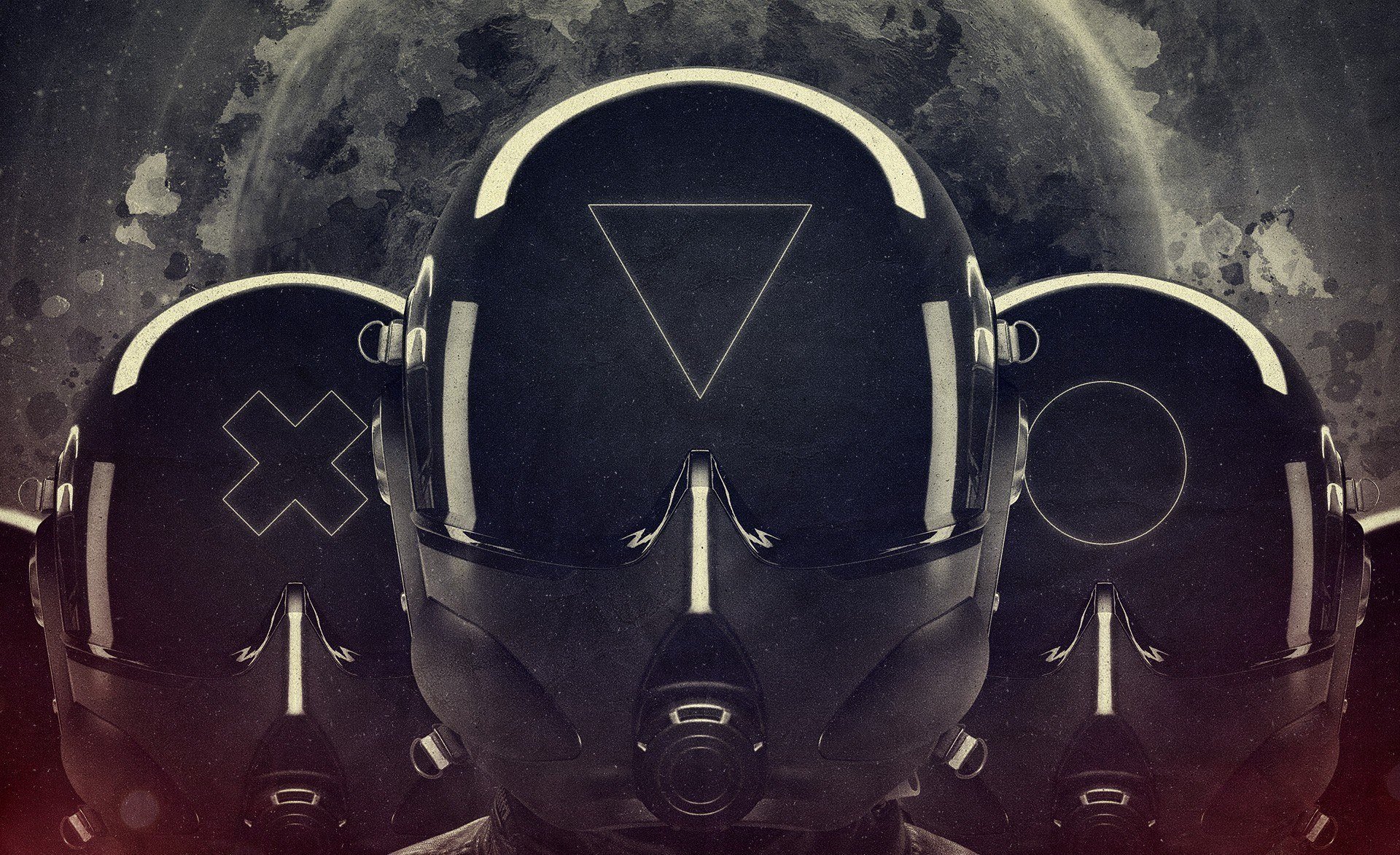 Un hombre de letras con un casco minimalista sobre un fondo púrpura