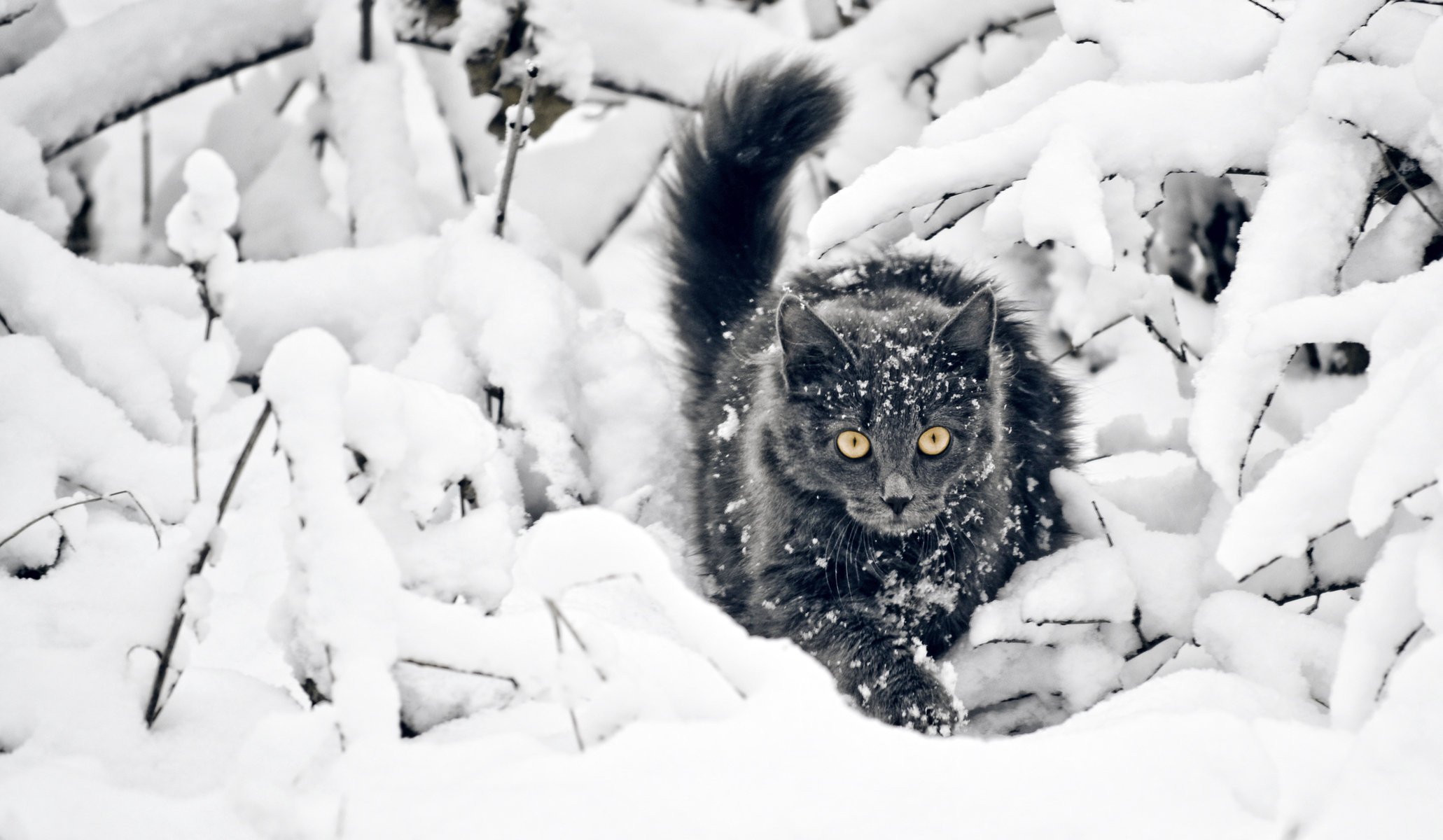 El gato cubierto de nieve se arrastra sobre la nieveEl gato cubierto de nieve se arrastra sobre la nieve
