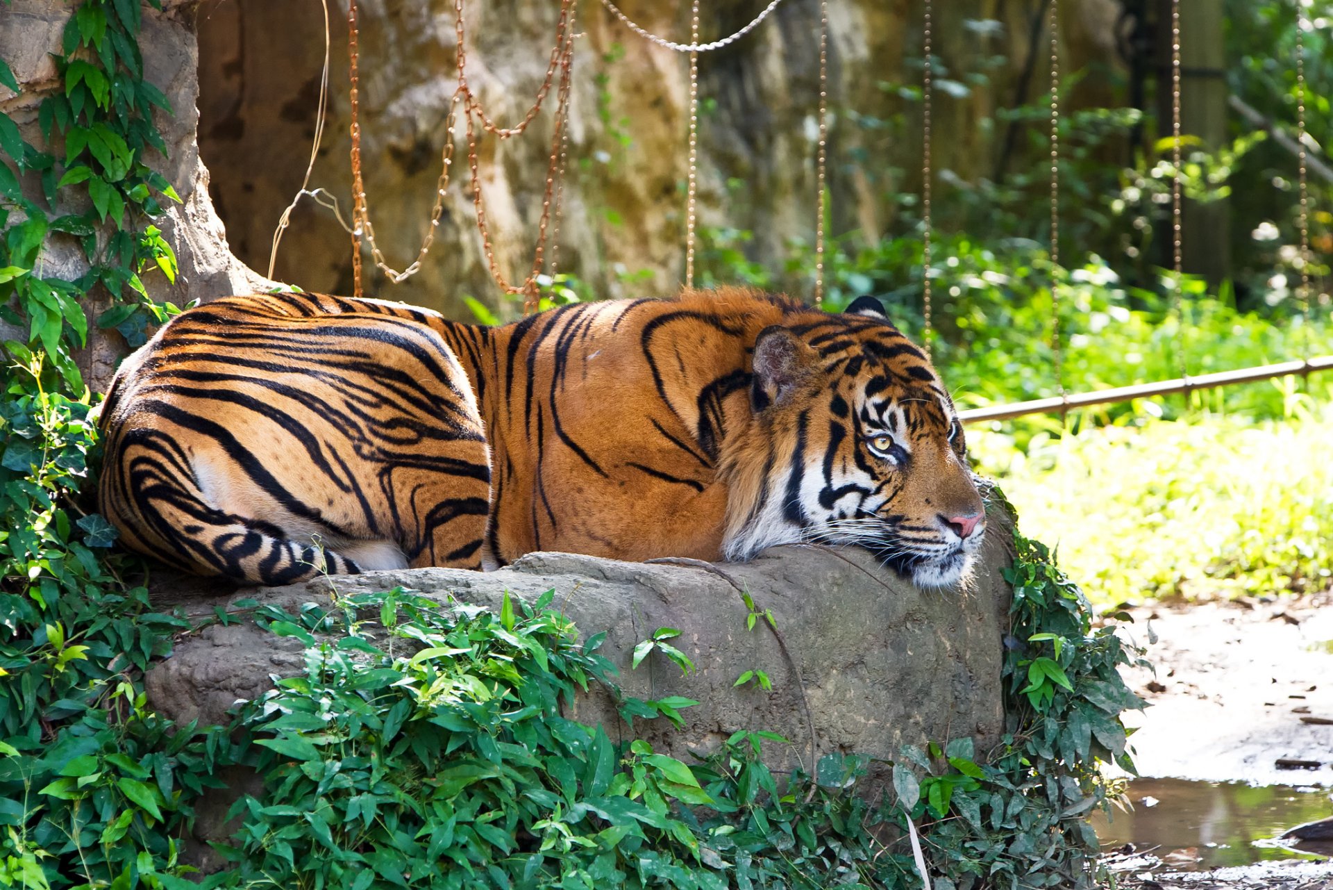 El lince de la estepa con la boca abierta y los colmillos yace en la hierbaEl lince de la estepa con la boca abierta y los colmillos yace en la hierba