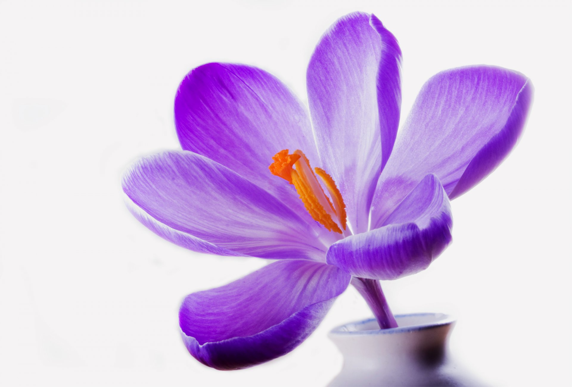 Azafrán lila en un jarrón blanco sobre un fondo blancoAzafrán lila en un jarrón blanco sobre un fondo blanco