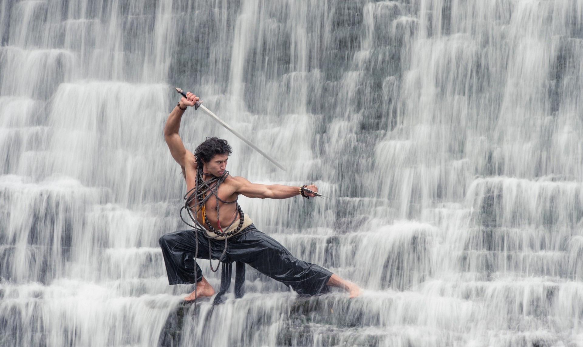 Un hombre con una espada en una cascada