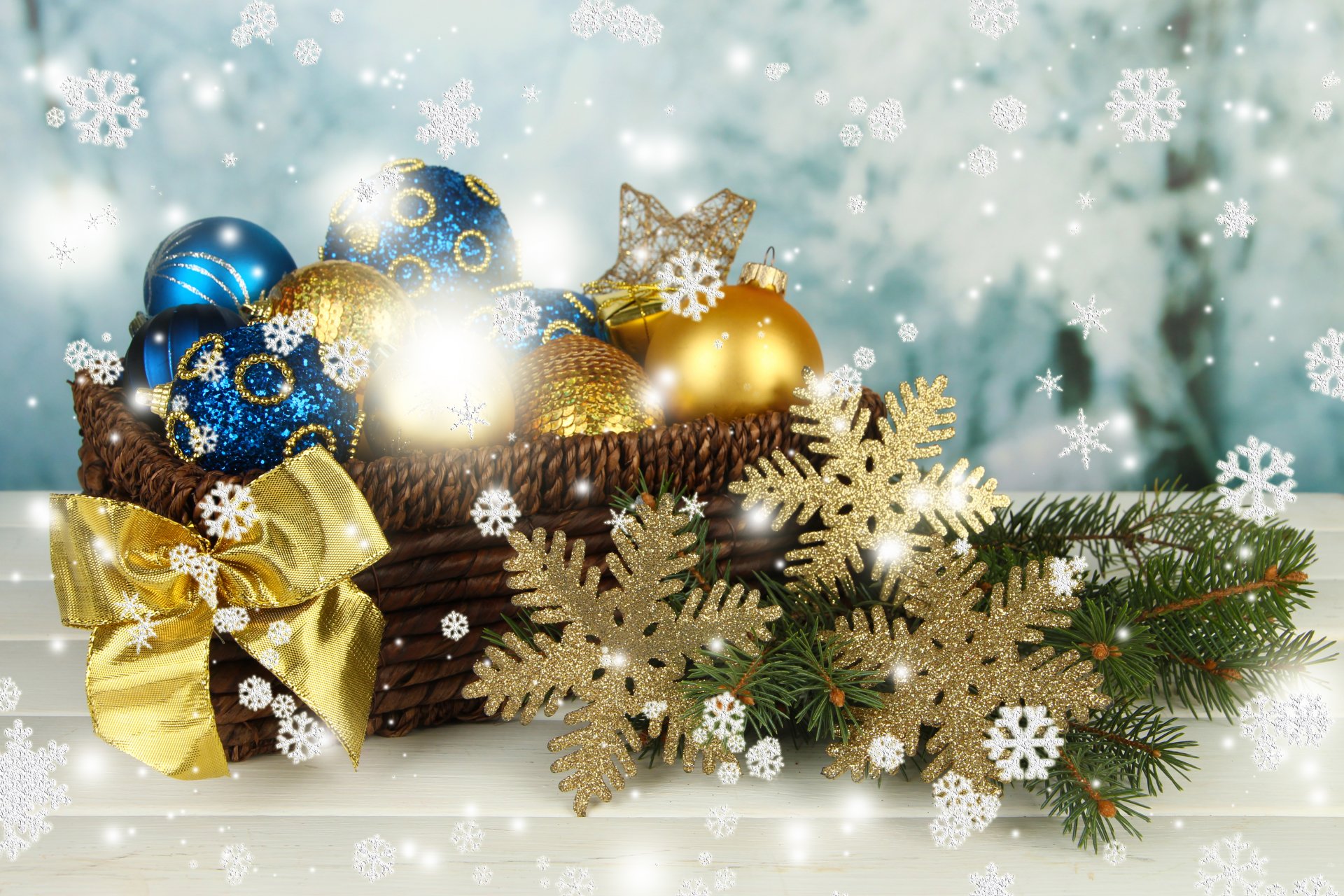 Adornos de navidad brillantes sobre un fondo azul con copos de nieveAdornos de Navidad brillantes sobre un fondo azul con copos de nieve