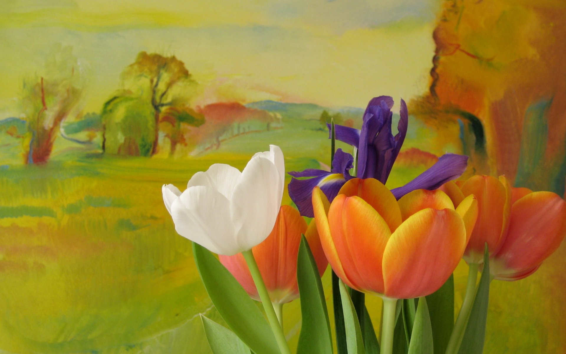 Campo de tulipanes con pétalos de rosa, desenfoqueCampo de tulipanes con pétalos de rosa, desenfoque