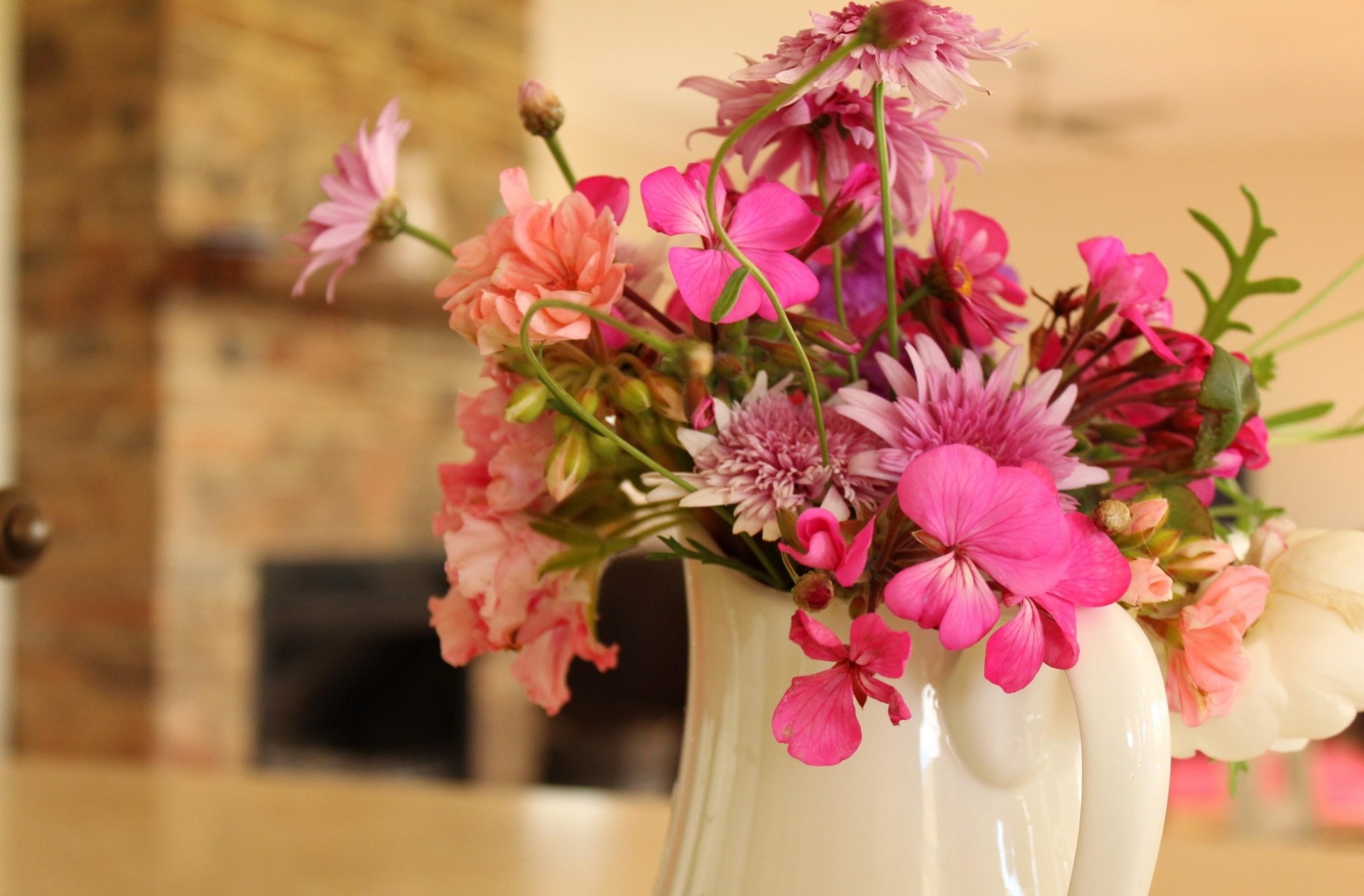Un ramo de flores favoritas de crisantemos y gerber en una jarraUn ramo de flores favoritas de crisantemos y Gerber en una jarra
