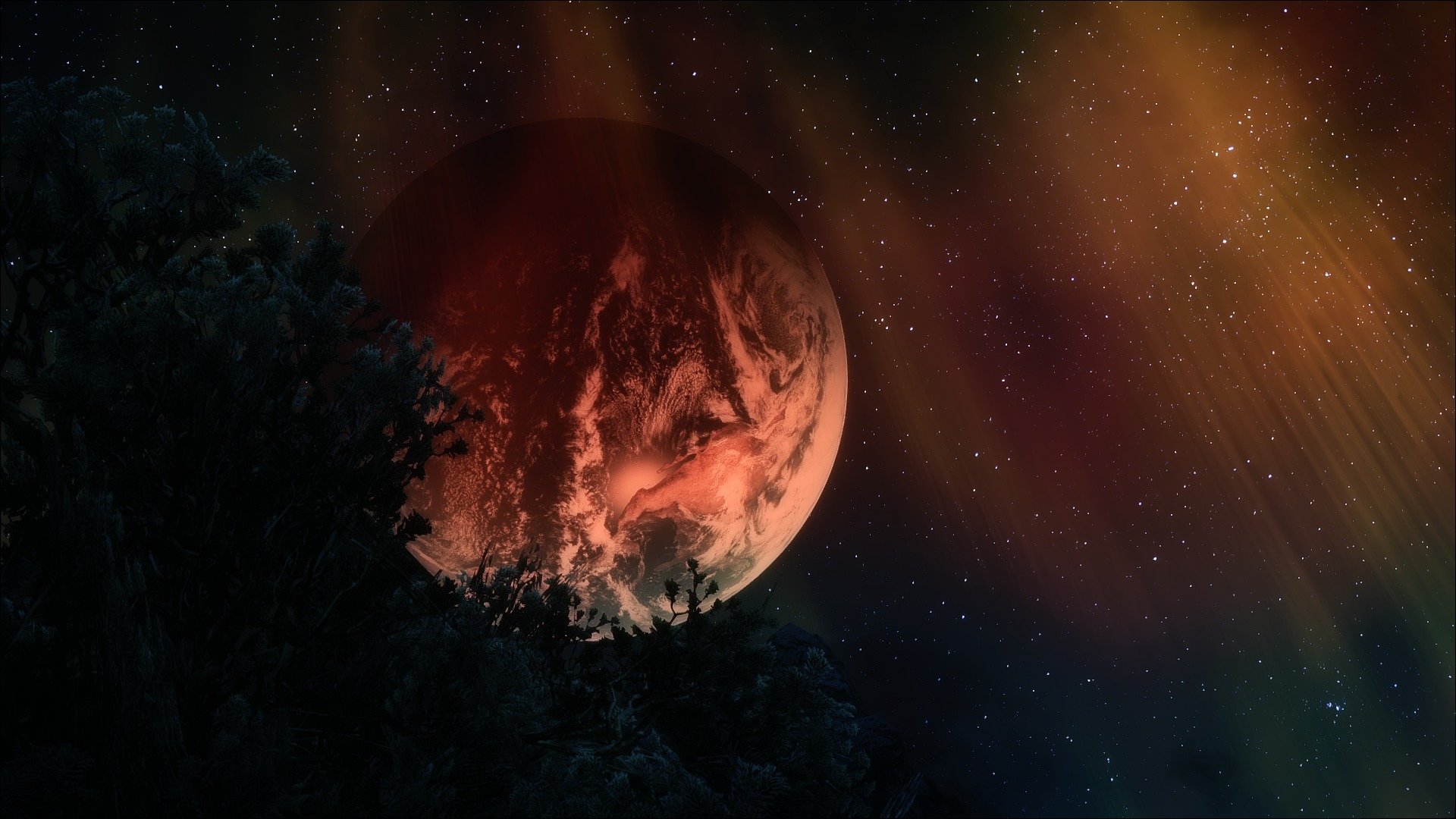 Panorama del campo con colinas y un planeta en el horizontePanorama del campo con colinas y un planeta en el horizonte